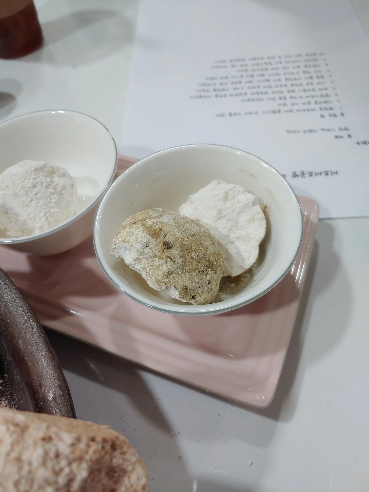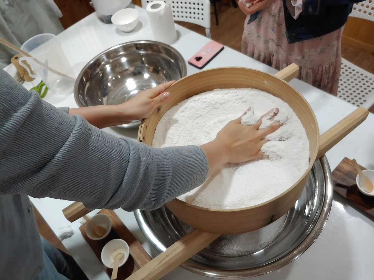 이화주 만드는 순서를 대략 적어보자면 첫 번째가 쌀가루를 곱게 고르는 일이었다. 이 이후 떡과 가루가 계속 묻어 사진이... 없다. 쌀가루를 고르고 물과 효모를 넣어 떡 형태로 만든다. 그렇게 뭉쳐진 떡 덩어리를 뜨거운 물에 익혀 물떡을 만든다. 그리고 그 떡을 다시 잘게 부순다. 모든 과정에 엄청난 팔힘과 리듬감이 소비된다. 하지만 정말로 나 빼고 힘이 좋으다. 운동과 생활 근육과 일로 다져진 힘을 떡을 부시는데 썼다. 공방 선생님도 앞 팀 남자들보다 잘한다며 엄청난 칭찬을 해주셨다.