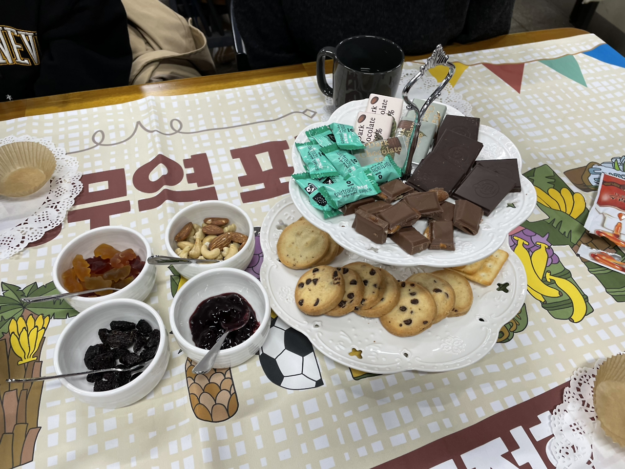빈 테이블에 공정무역 제품을 진열하고 사람들이 앉는 테이블엔 공정무역 간식과 커피와 티를 깔아놓고 시작한다. 구성원은 티푸드를 즐기며 공정무역에 강의를 듣는다. 진짜(?) 티파티라 조금은 생소한 공정무역 간식이 깔린 구성을 신기해하며 좋아한다. 게다가 먹으면서 듣는 거라 강의를 듣기에 부담이 적다. 그리고 맛있다. 촵촵.