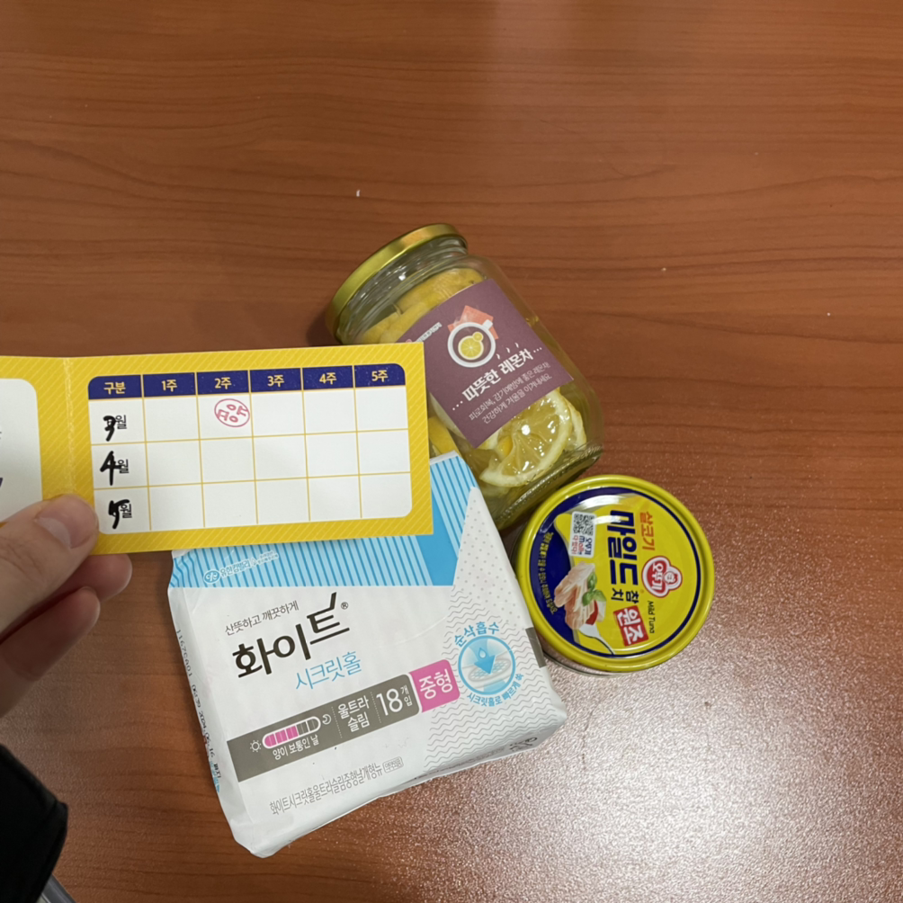 그렇게 생리대, 참치, 레몬청을 받아왔다. 방역수칙을 지키면서 차별 없이 물건을 나눠주는 그냥 드림 코너. 할머니들 말고 다양하게 힘듦을 겪고 있는 분들이 들러서 필요한 물품을 받아갔으면 하는 마음이다.