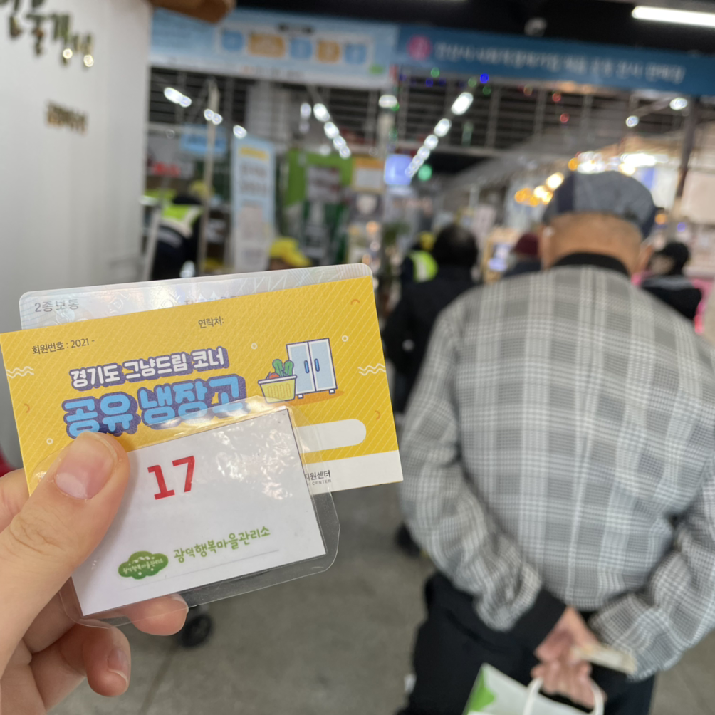 코로나 때문이라 1m 거리두기를 하여 줄을 서서 번호대로 기다리면 순번이 온다. 준비물은 내 신분증과 노란색 공유냉장고 카드이다. 이것을 들고 광덕 지킴이 선생님이 신분확인을 하면 공유냉장고에서 물품 3가지를 선택할 수 있다. 나는 생리대 3개를 가져가려 했는데 중복 물건은 안되고 서로 다른 것 3가지가 가능하다고 한다.