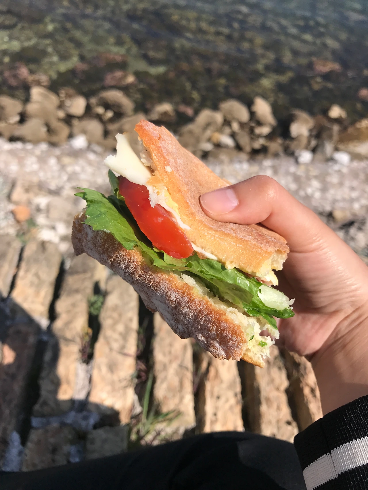 동네 주위는 아찔하게 파란 바다가 가득이고 사람들은 작은 해변에서 이른 물놀이를 시작했다. 나는 모든 것을 바라보며 손수 만든 샌드위치 점심을 먹었다. 0.8유로의 바게트와 토마토, 치즈, 로메인을 넣은 샌드위치. 한쪽 면엔 버터 한쪽면엔 디종 머스터드. 어느 하나 맛없는 게 없으니 꿀맛 샌드위치! 내가 바로 샌드위치 솊이다!