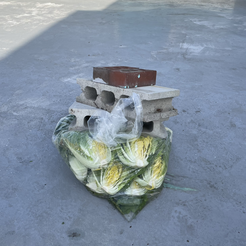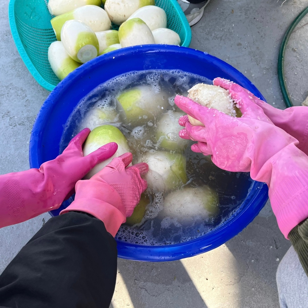 재배한 배추는 속이 차지 않았고 크기가 작았다. 무는 무대리처럼 모두가 작고 똥똥했다. 크기는 작았지만 무랑 배추는 달달하고 시원했다. 배추보다 무가 많아 깍두기도 담그기로 했다. 하지만 양념 양 조절 실패로 깍두기는 할 수 없었다. 깍두기 한다고 무 다 썰어버렸는데... 어쩔티비... 당연히 속 레시피는 아무도 알아오지 않았고 인터넷으로 백종원 김장 레시피를 따라 대강 만들었다. 특제 비법으로 육수 대신 비비고 사골육수도 넣었다. 사실 원래 목표는 비건 김치였는데 백종원 레시피는 비건이 아니므로 젓갈과 육수만 배제한 비건 김치를 소량 따로 담갔다.
