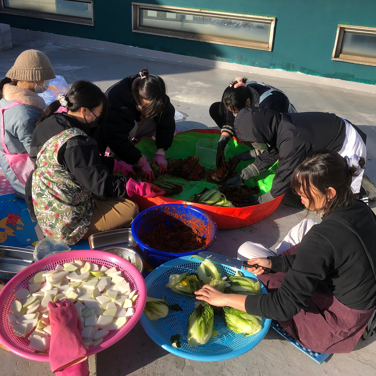 나는 10시조였고 우리 팀은 절여진 배추를 뒤집고 무를 뽑고 쪽파를 다듬고 속에 들어갈 무를 강판에 갈았다. 다듬기를 끝내고 점심 먹고 모이기로 해서 시간이 넉넉할 줄 알았는데 시간이 후딱 가 버렸다. 김장 밑 작업하면서 추웠는지 목이 까끌했다. 몸도 노곤해져서 김장을 할 기운이 나지 않았다. 하지만 우리에겐 조상님들 지혜가 있다. 기운을 나게 하는 건? 역시 막걸리지. 김장 시작 전 막걸리 한잔씩 마시고 김장준비에 나섰다.