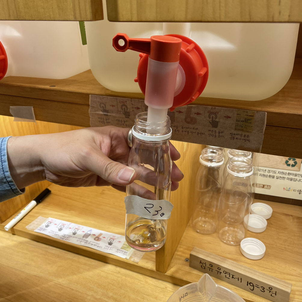 원래 빨래 세제를 리필하고 싶었는데 친환경 제품이라 해도 빨래 세제는 세정력이 강한 편이라 마트에서 파는 단단한 플라스틱 통에 담아야 한다고 한다. 현재 그 정도의 재사용 가능한 용기가 없어서 주방 세제 리필을 추천해 주셨다. 주방 세제는 음료통같은 약한 플라스틱에도 삭지 않는다고 한다. 주스양 만큼인 100미리 정도를 리필했는데 겨우 1,600원만 소비했다. 개쌈!