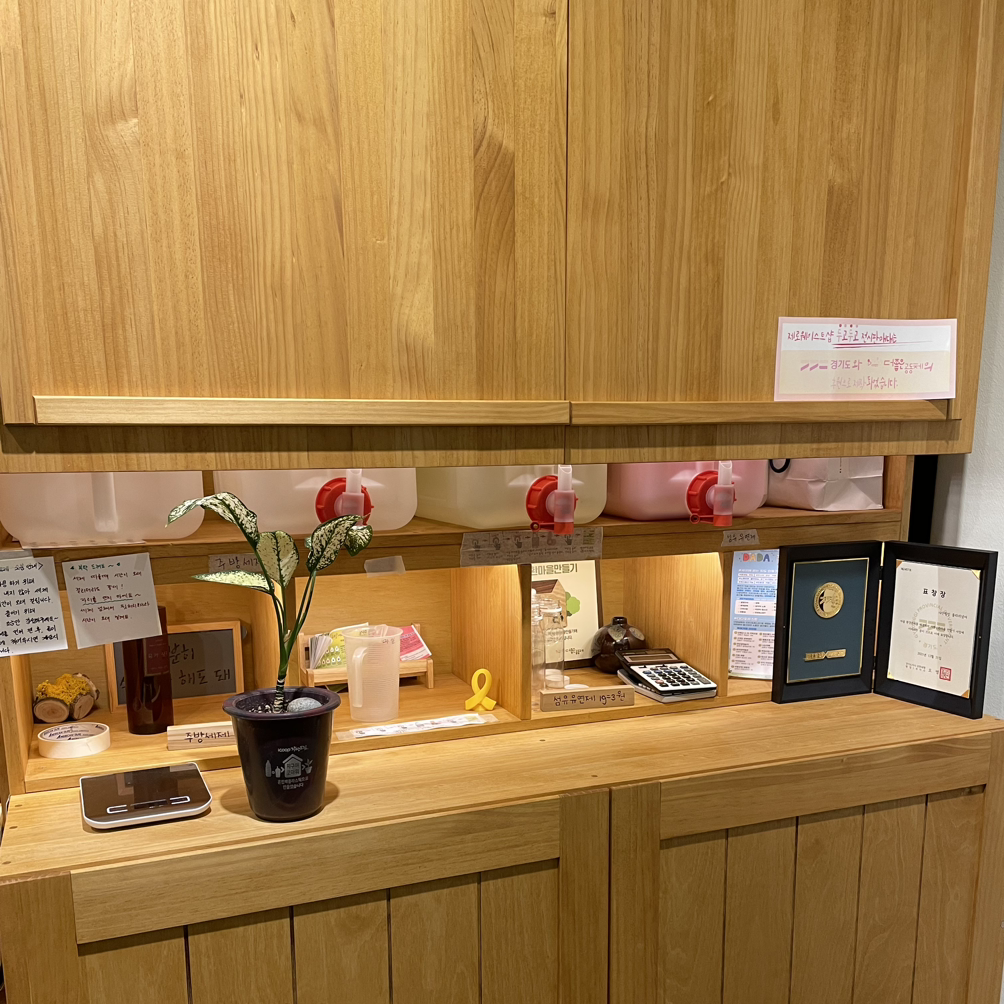 나는 대부분의 제로웨이스트 제품을 과하게 선물 받아서 딱히 살만한 건 없었고 세제를 리필해 보기로 했다. 세제는 지역 내 자활센터에서 만든 섬유 유연제, 빨래 세제, 주방 세제를 판매하고 계셨다. 리필 스토어도 지역 내에서 물건을 구매하여 이동하는 탄소양을 줄이셨다.