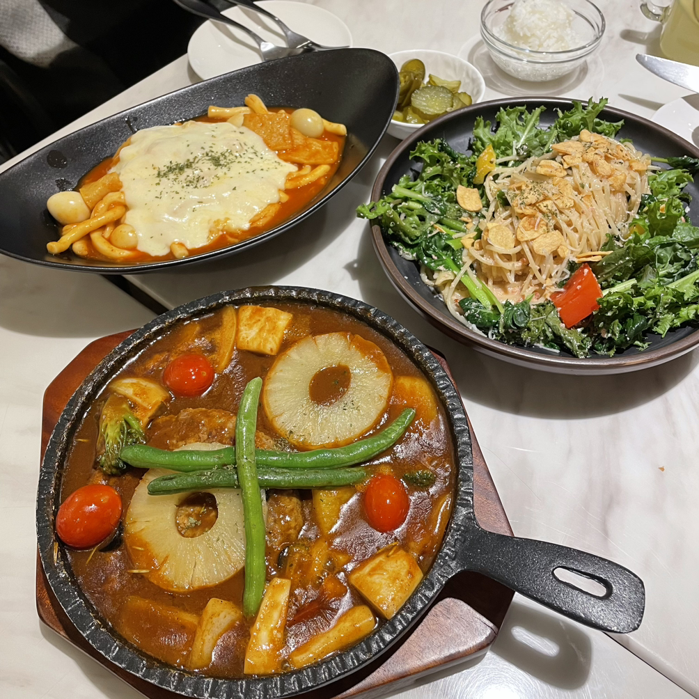 탐방까지 시간이 남아 마실의 대표 메뉴인 떡볶이, 명란오일파스타, 함박스테이크를 시켜 먹었다. 떡볶이는 우동면 굵기의 면같은 떡이라 좋아하고 오일명란파스타엔 야채가득 명란가득이라 좋아한다. 함박은 내스타일은 아닌데 함께 간 고기매니아 은산&한실이 뿌셔버렸다.