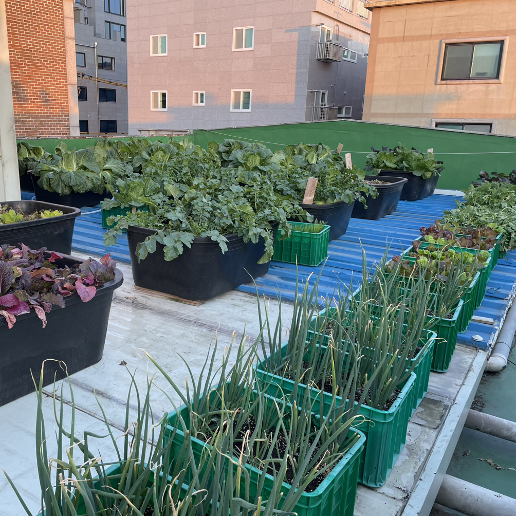 텃밭매니아로써 옥상텃밭도 구경했다. 유럽의 몇 나라에선 농작물을 재배하고 도시로 이동하는 것도 탄소 소비이기 때문에 간단한 작물을 직접 키워먹는 방법으로 탄소 절감을 한다고 한다. 마실의 옥상에선 김장철을 맞이해 무랑 배추가 자라고 있었다.