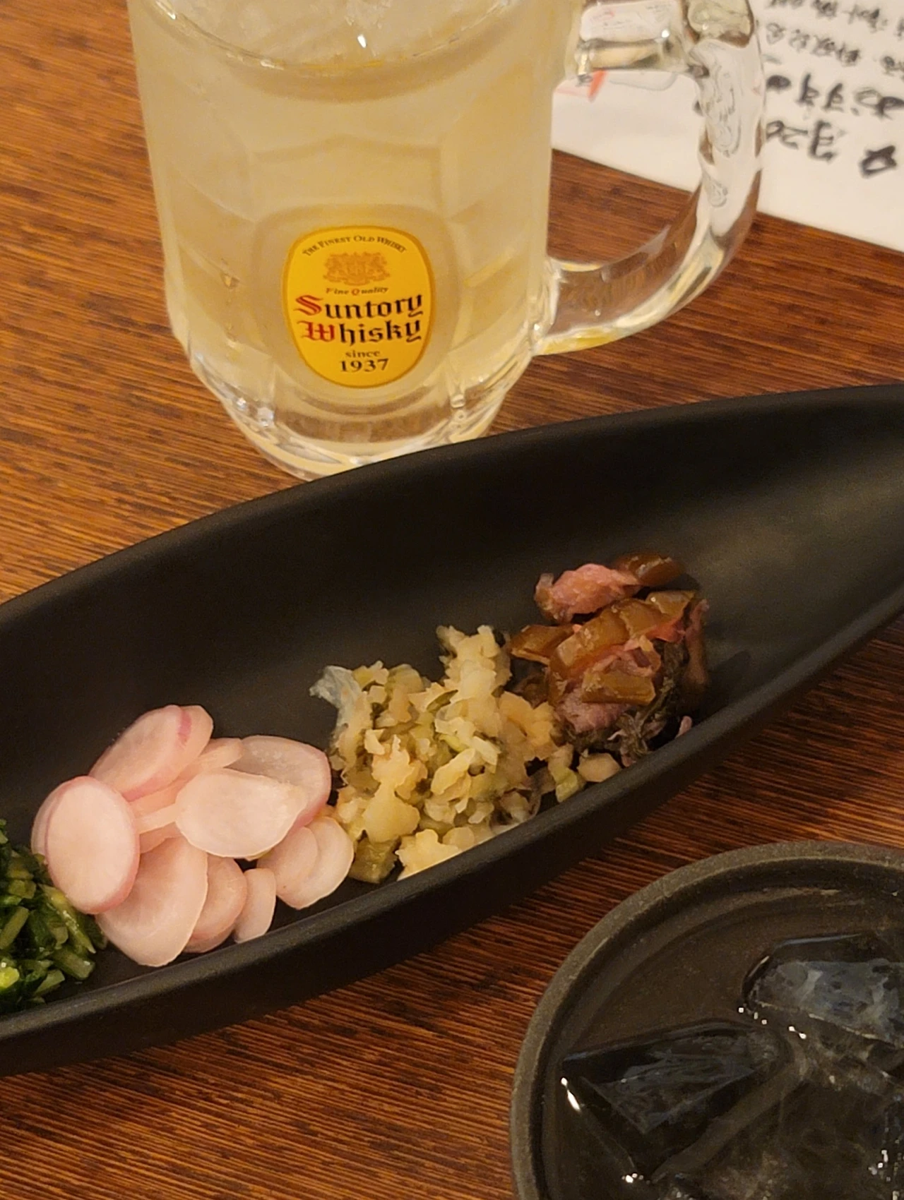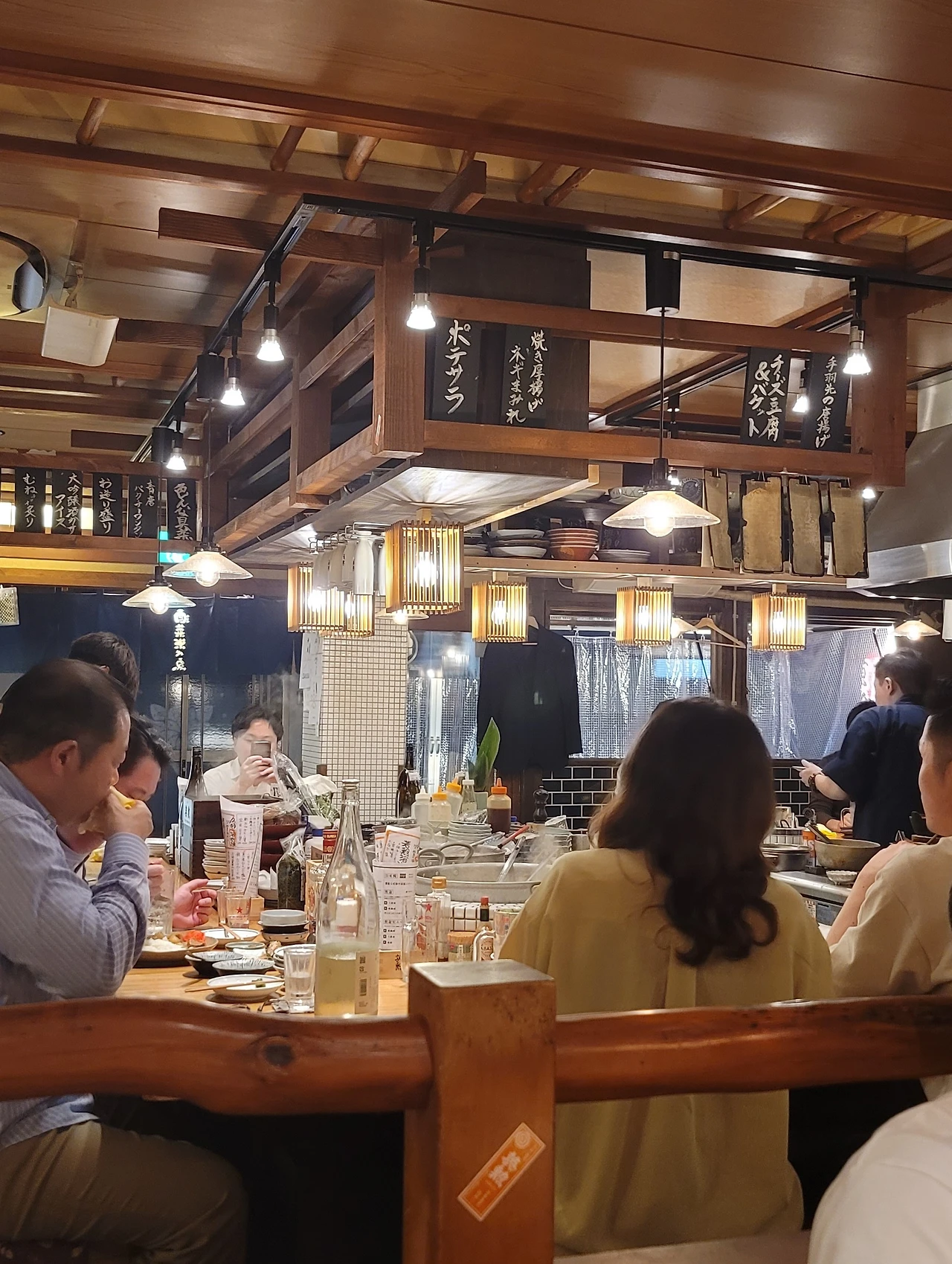 숙소에서 휴식을 취한 후 저녁엔 이자카야에서 술을 한잔하며 저녁을 먹기로 했다. 어제는 예약이 꽉 차게 사람이 많더니 오늘은 거리에도 가게에도 사람이 없었다. 한산한 교토의 이자카야에서 우리는 야채절임, 교자, 감자샐러드, 크로켓과 고구마 소주와 하이볼, 따뜻한 사케와 차가운 사케 도쿠리로 한 병씩 먹었다. 타파스 가게처럼 양이 적게 나오는 가게였다. 교토 직장인들은 와인 한 잔이나 맥주 한 잔 먹고 갔다. 그래서 이 정도만(?) 먹고 2차로 좀 더 시끄럽고 안주가 많은 이자카야를 찾아 나섰다.