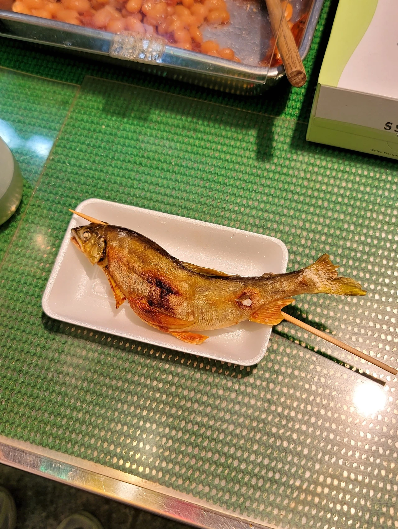 사케가 사고 싶어 니시키 시장에 들렀다. 5년 전에 이곳에서 지역술을 샀던 기억이 있어 왔다. 하지만 지금은 관광객을 위한 이자카야나 구잇집 그리고 기념품 가게가 대부분이었다. 우리는 은어 한 마리만 먹고 니시키 시장을 나와 산조 역 근처까지 나왔다. 마침 고급 식자재 가게를 발견해 군고구마 소주를 살 수 있었다.