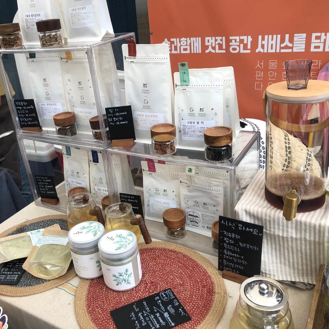 농부가 된 사진가 부스에선 잡초인줄 알았던 풀들을 판매하고 계셨다. 이곳도 농부님의 적극적 시식. 또 다 먹어보라며... 고수꽃 시식, 두메부추도 시식, 괭이풀도 시식했다. 괭이풀은 진짜 흔한 네잎클로버인데 열매에서 신맛이 난다. 왕신기!!