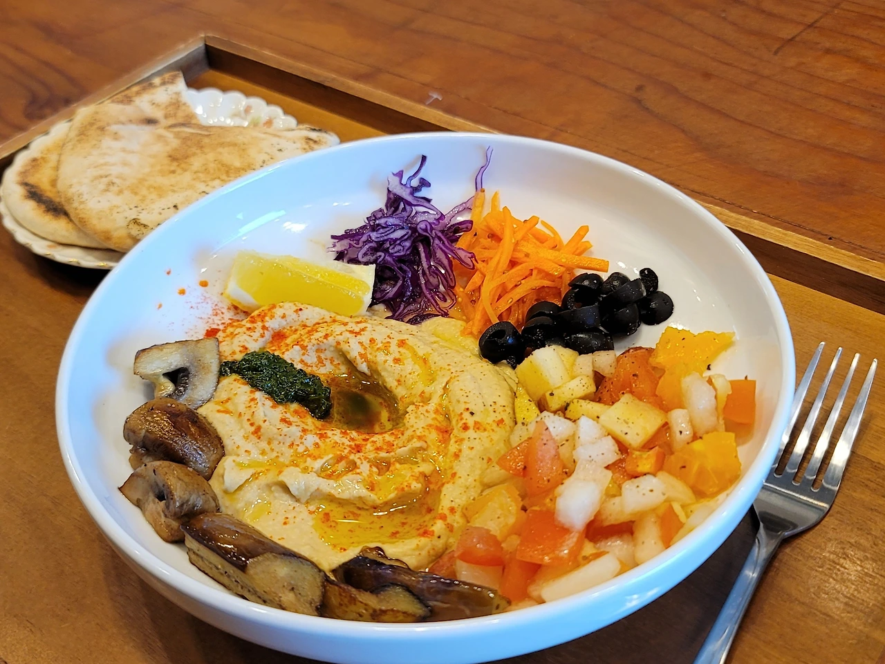 처음 도착하자마자 간 곳은 군산의 양식당 #음미당. 비건 옵션인 호무스가 맛있다 하여 들렀다. 내부에 다양한 공간인 식물존, 그림존, 단체 다이닝이 가능한 공간등이 있었다. 특히 눈에 띄는 건 들어가자마자 보이는 거대한 보호수였다. 사장님께 저 나무가 건물 안에 들어와도 되냐 물었더니 주민들 동의를 받아 가게 안에 살려둔 것이라 하셨다. 이태리 느낌을 위한 건물 내부의 조명과 색채도 맘에 들었다. 호무스 맛집답게 비건분들은 맛있게 먹었고 빵덕인 나도 빵을 너무 맛있게 먹었다.