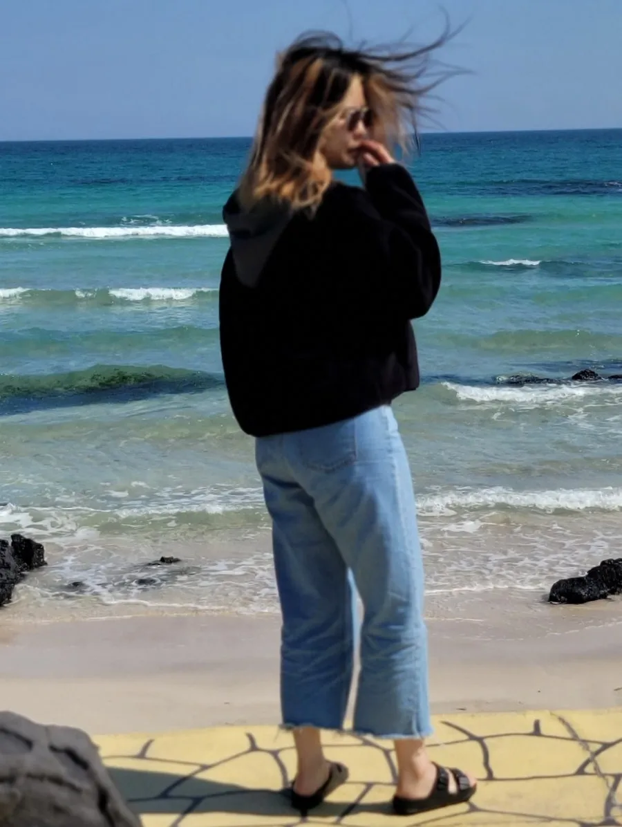 이렇게 찍기도 힘들 듯 다음날 비온 뒤라 날씨가 매우 좋아졌다. 기절한 나도 꿀잠 덕에 컨디션이 좋았다. 거지 같은 숙소를 새벽같이 퇴실하고 세화 해변에서 아침 요깃거리로 톳김밥과 당근주스를 사서 아침 산책을 했다. 바람은 꽤 불었지만 바다를 보기엔 좋은 날씨였다.