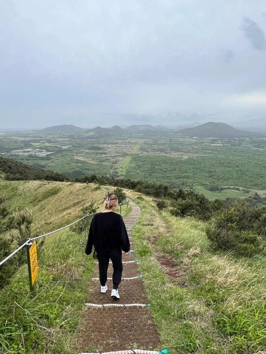 한치까지 챙겨 먹으니 비가 수그러들었다. 저녁밥 시간까지 애매하게 시간이 있어 다랑쉬 오름에 올라갔다. 프로 운동인 김원장은 샌들 신고 꽤나 깊은 언덕을 빠르게 올라간다. 바닥이 험준한 곳도 많았고 비온 땅이라 미끄러운 곳도 많았는데 폰을 보고 달인처럼 휙휙 올라간다. 수영을 2년 연속으로 한 운동화 신은 나는 미끄러지기도 하고 숨이 차고 또 차고 내 체력 짜증 난다.