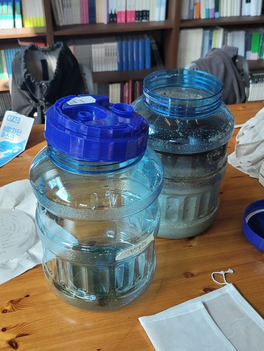 그리고 생활관에서 디저트 타임을 하고 있는데 책 사장님이 막걸리를 걸러야 한다고 하여 다급하게 다이소에서 채반을 사서 막걸리를 걸렀다. 이 막걸리는 숙성시켜 김장날 먹을 예정이다.