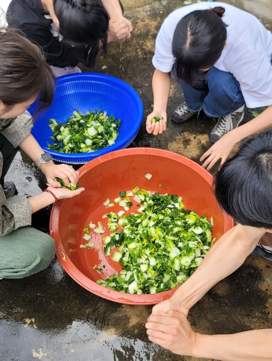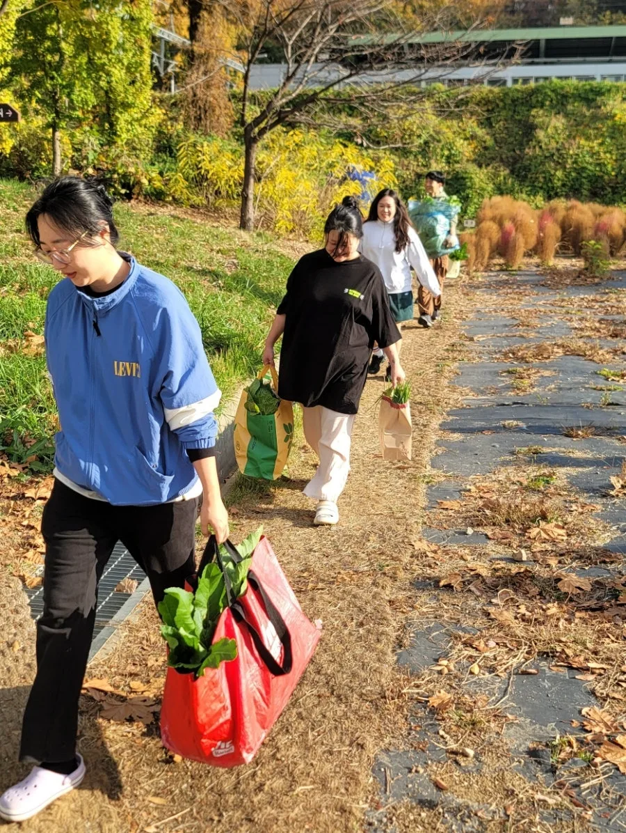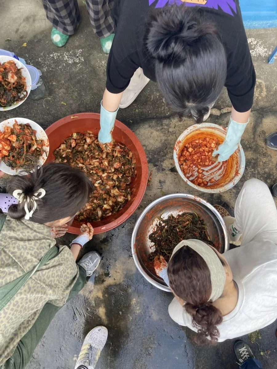 김치 만들기 경력자인 진아님과 가지님이 주도해서 배추를 다듬고 절였다. 금쪽이라 부르고 김치 만들기 비기너인 지현님과 병훈님에겐 야채 다듬기 임무를 시켰다. 확실히 옥상텃밭과 다르게 작물 양이 많았다. 욕심내서 전부 김치로 만들고 싶었지만 수민님이 말려서 반 정도만 김치를 만들기로 했다. 남은 야채는 나눠가지기로 했는데 1인 가구가 많고 요리를 아예 안 하는 사람도 있어서 결국은 진아, 가지, 나, 수민 이렇게만 야채 폭탄으로 배추를 가져갔다.