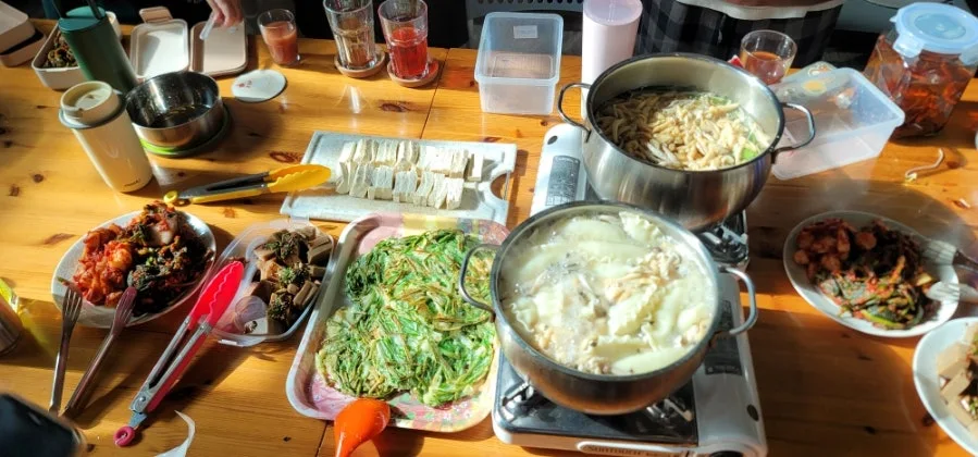 생활관 안에선 고구마 풀과 나머지 야채를 다듬고 김치와 함께 먹을 전골과 묵, 전을 준비하고 있었다. 겉절이 김치라 3시간이면 만들 줄 알았는데 시간이 꽤나 걸렸다. 나중엔 가지님이 초대한 호스트까지 합세해 절인 김치를 씻고 버무려서 4시간 만에 겉절이 김치를 완성했다. 우리의 김치는 서정아 레시피를 참고한 비건 김치인데 가지님은 전문가가 다 되어서 양념 비율 따위 보지 않고 소금이던 고추가루던 휘휘~ 넣어 만들어재꼈다. 겨우 3년이지만 나름 김치전문가가 되어 할 일을 알아서 착착 해내는 호스트, 게스트를 보니 매우 뿌듯했다. 허허허 이 고인 물은 하산해도 되겠구려 허허허.