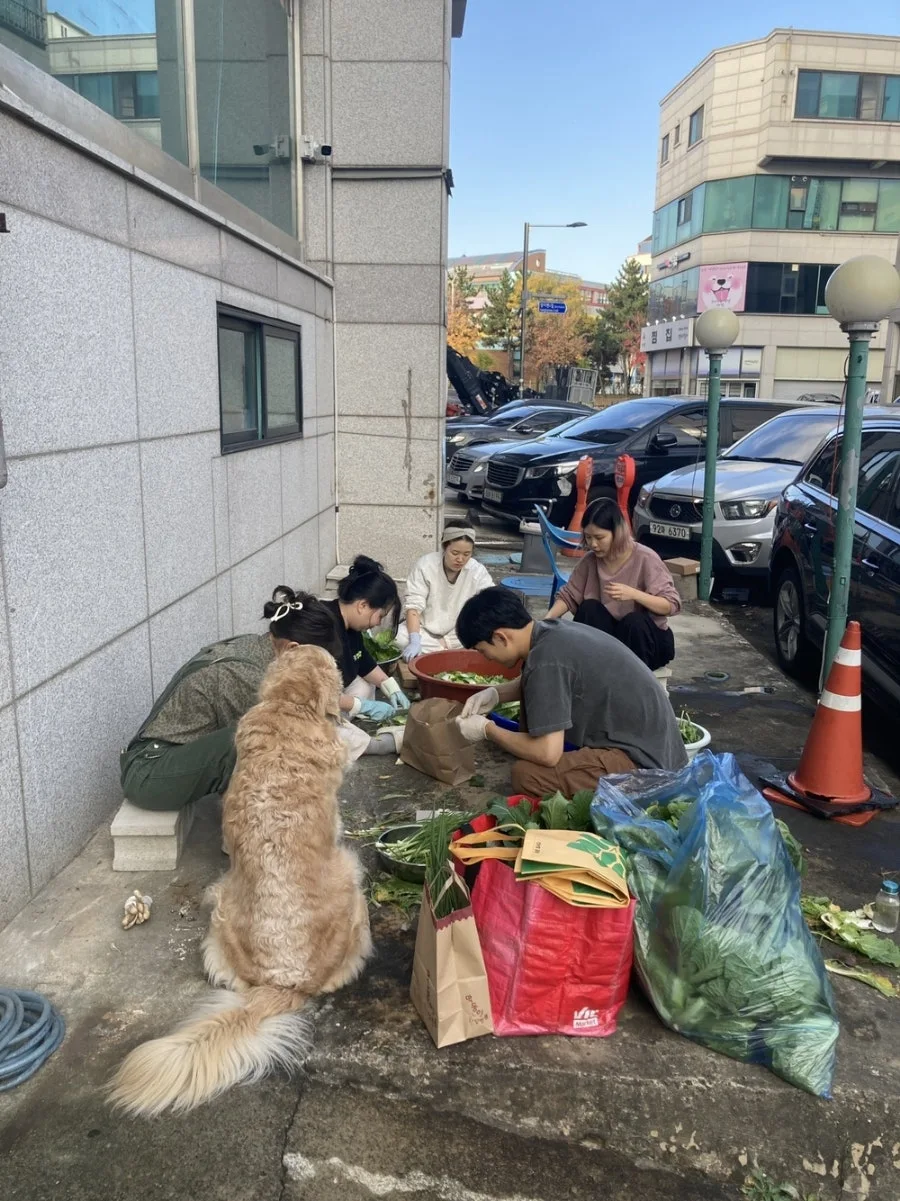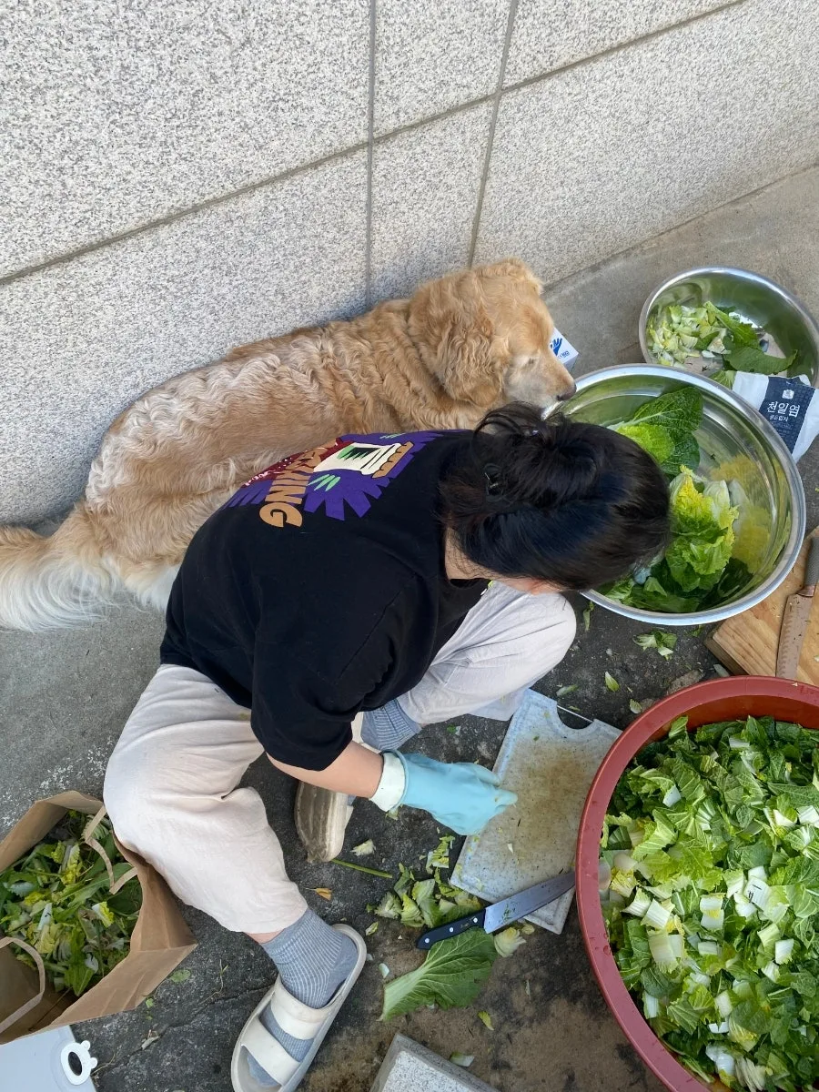 생활관 뒤편에 자리를 잡아 김치 만들 재료를 다듬었다. 소소는 와서 참견하고 관찰하고 털 뿜고 완전 개깝치네? ㅋㅋㅋㅋㅋㅋ