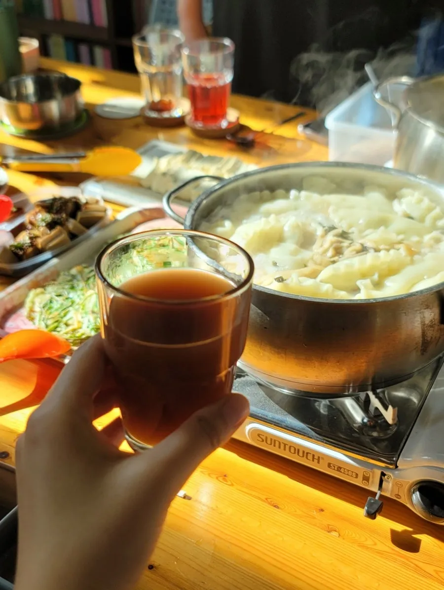 전 부치기 장인인 정아님이 만든 전은 바삭했고 우리가 전에 만들었던 막걸리는 숙성되어 아주 고급 지고 드라이한 와인 같은 술이 되었다. 김치 전문가인 가지님이 후다닥 만든 전골인지 떡만둣국인지도 맛있었고 노동 후에 먹는 것이라 더욱 값지고 뿌듯하고 개꿀맛도리.