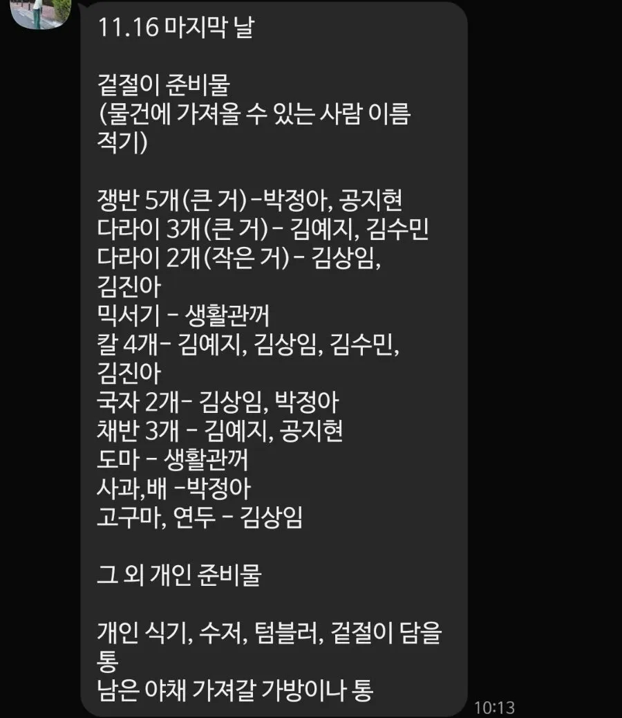 한대앞 텃밭은 정리가 11월 23일까지라 그전인 11월 16일 토요일로 김장날을 잡았다. 벌써 다음 주길래 밭에 간단하게 물 주고 1시간 만에 모임을 끝냈다. 항상 마지막은 제로웨이스트와 비건을 지향하기 때문에 집에 있는 재료나 주방도구를 가져오곤 한다. 그래서 카톡으로 먹을 메뉴를 정하고 각자 가져와야 할 준비물을 정하고 장 볼 것을 정했다.