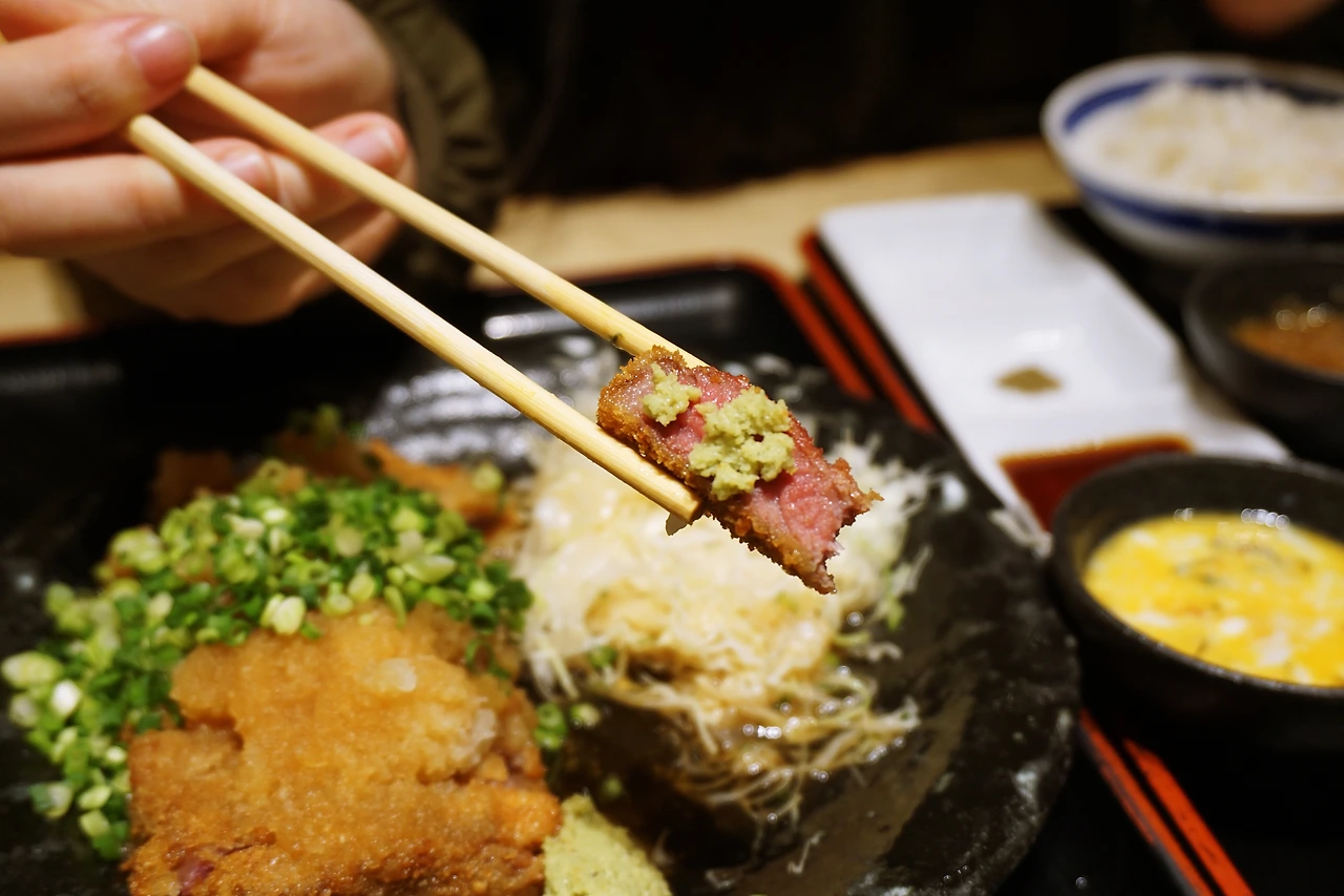 가게에서 메뉴를 보고 있는데 '3번이 맛있어요' 라며 잘생긴 일본인 주방장이 한국말을 하더라고. 잘못 들은 줄 알았더니 한국인 직원이란다. 훈남 직원이 추천해준 무를 함께 간 레어에 가까운 규가츠를 먹었다. 언니는 생계란에 미디엄의 규가츠를 골랐다. 육회를 좋아하는 나로선 무 + 파 + 레어 규가츠의 풍미와 식감이 좋았다. 소고기가 고소하게 씹히고 느끼함은 무와 파가 잡아주어 조화를 이루는 또 먹고 싶은 맛이랄까.