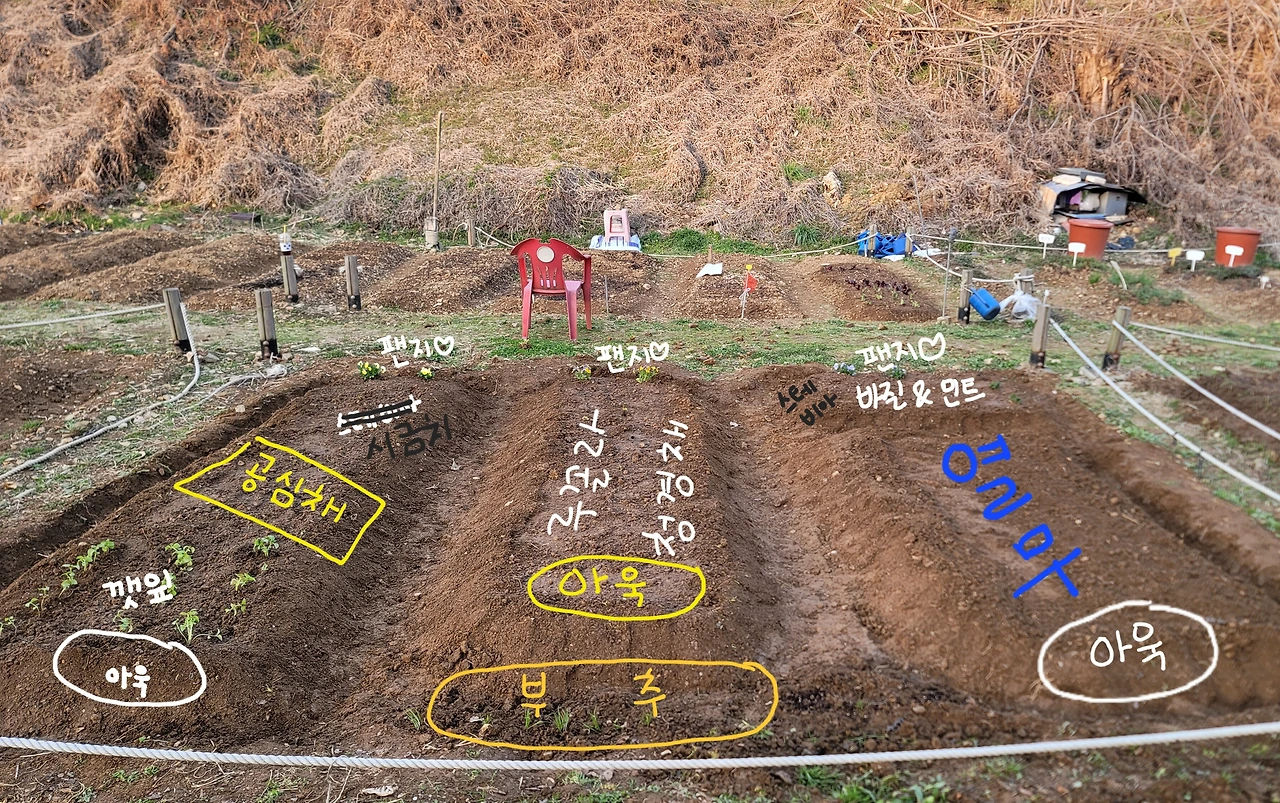 올해 텃밭모임 신청자들도 많았다. 내가 농한기동안 차모임, 와인모임 등 열심히 쏘다니면서 텃밭 활동의 장점과 정서적 이득 같은 걸 말하고 다녔더니 그동안 자연 감수성을 가진 사람의 마음에 동요가 일어났는지(사실 이 이유로 신청했는지는 알 수 없음, 나의 추측임) 정말로 텃밭모임을 신청했다. 올해 삽질할 사람이 많아서 너무 맘이 편하구먼요? 크크크크크