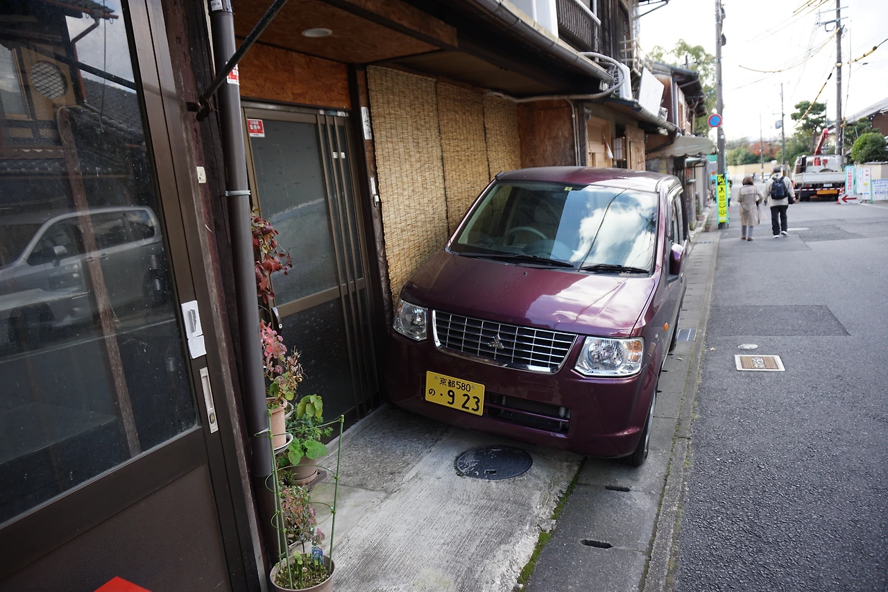 에이칸도에서 나와 교토의 동네길을 걷다 주차 실력이 엄청난 차를 보았다. 초접근 측면 주차.