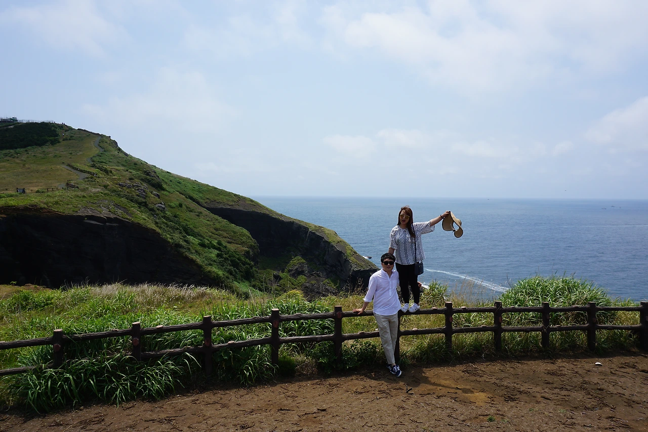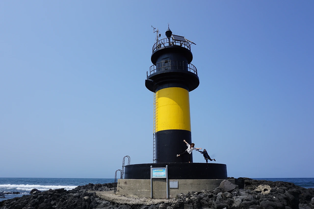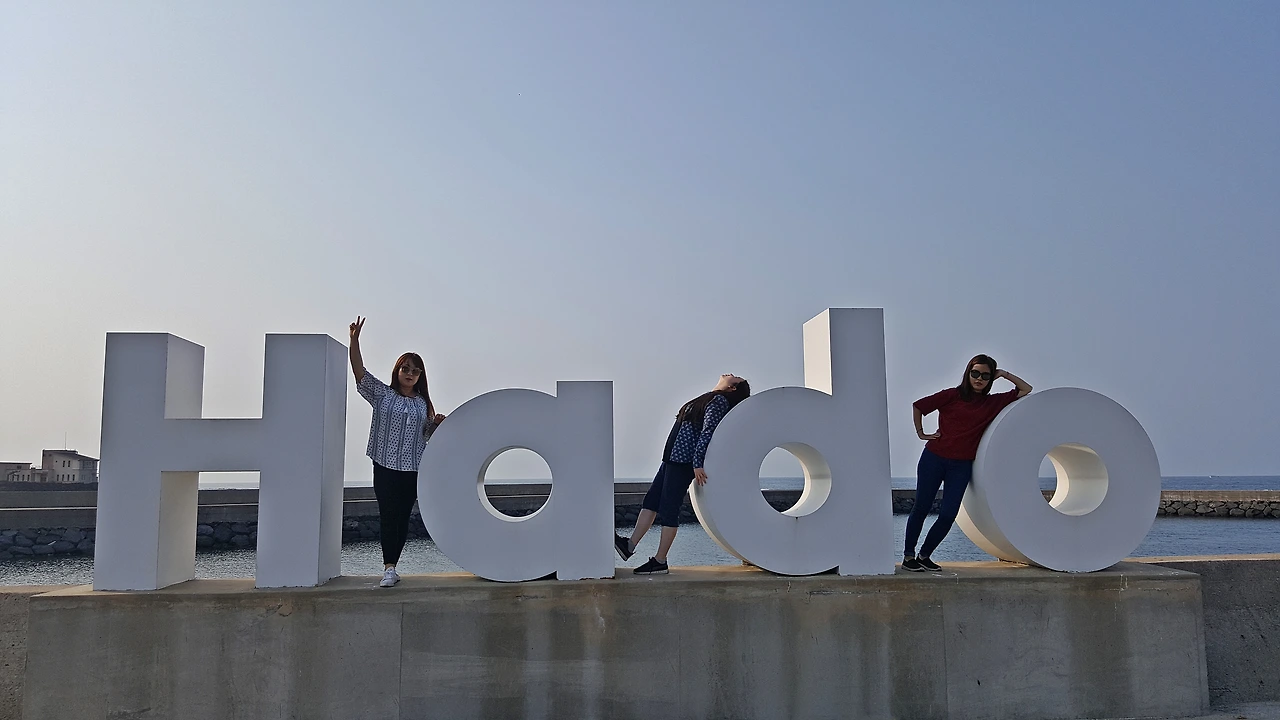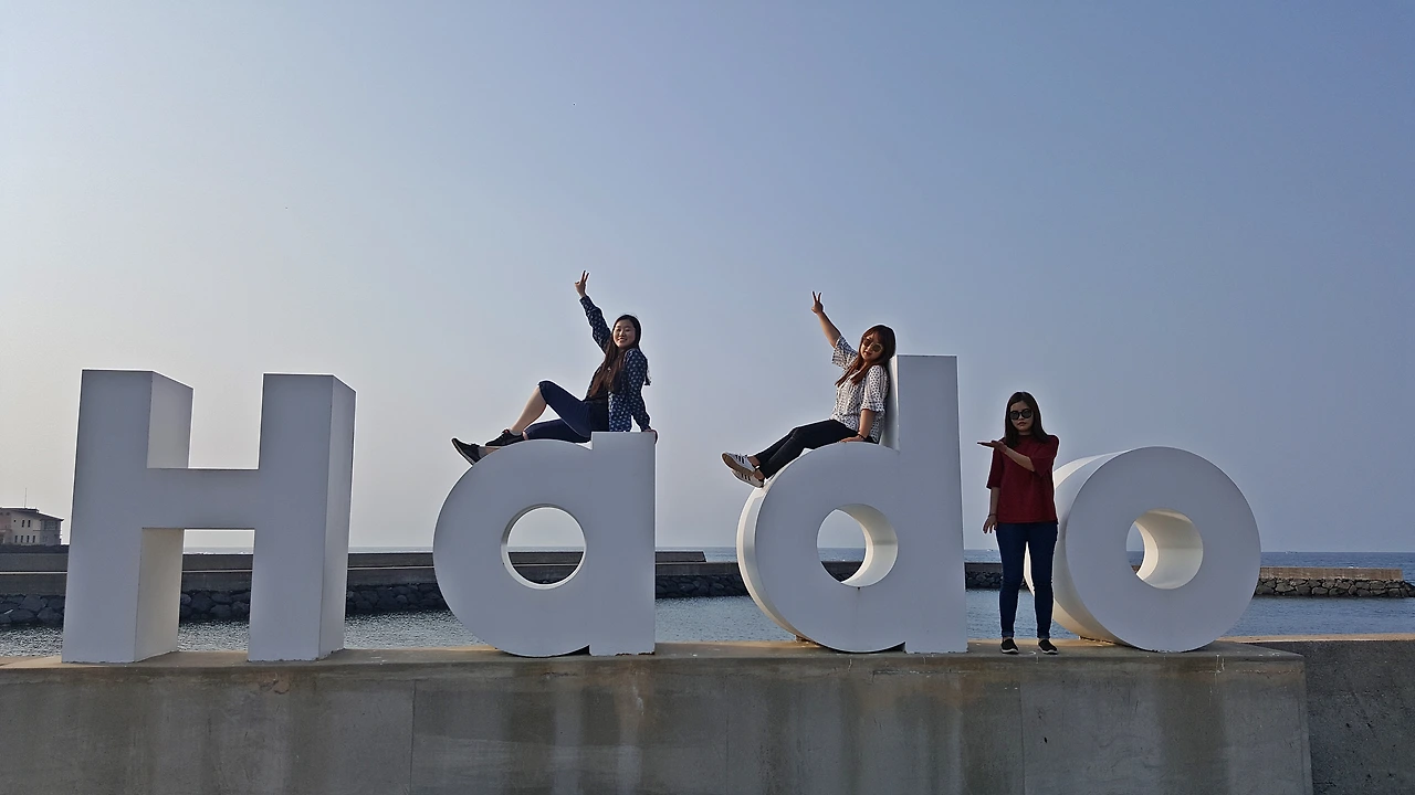한동리 숙소로 돌아가는 길에 발견한 Hado 조각! 뒤쪽이 절벽이고 그 밑은 바다가 보이는 하도 조각상 위를 언니들은 겁 없이 올라갔다. 소시미한 나는 쭈구리처럼 밑에서 사진을 찍는다...
