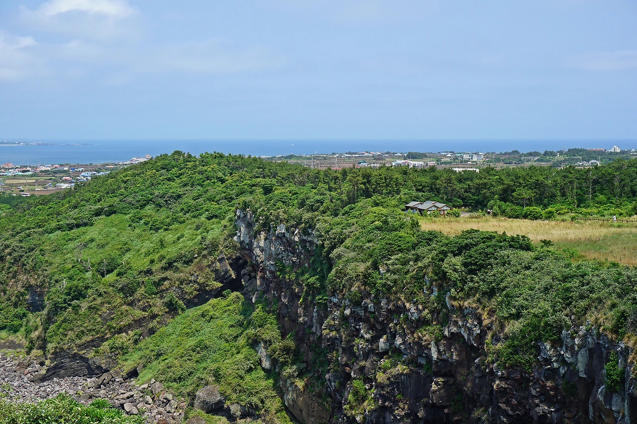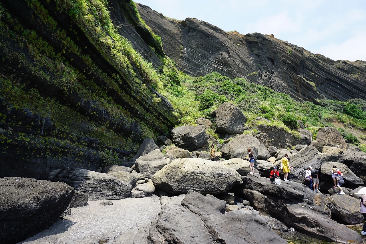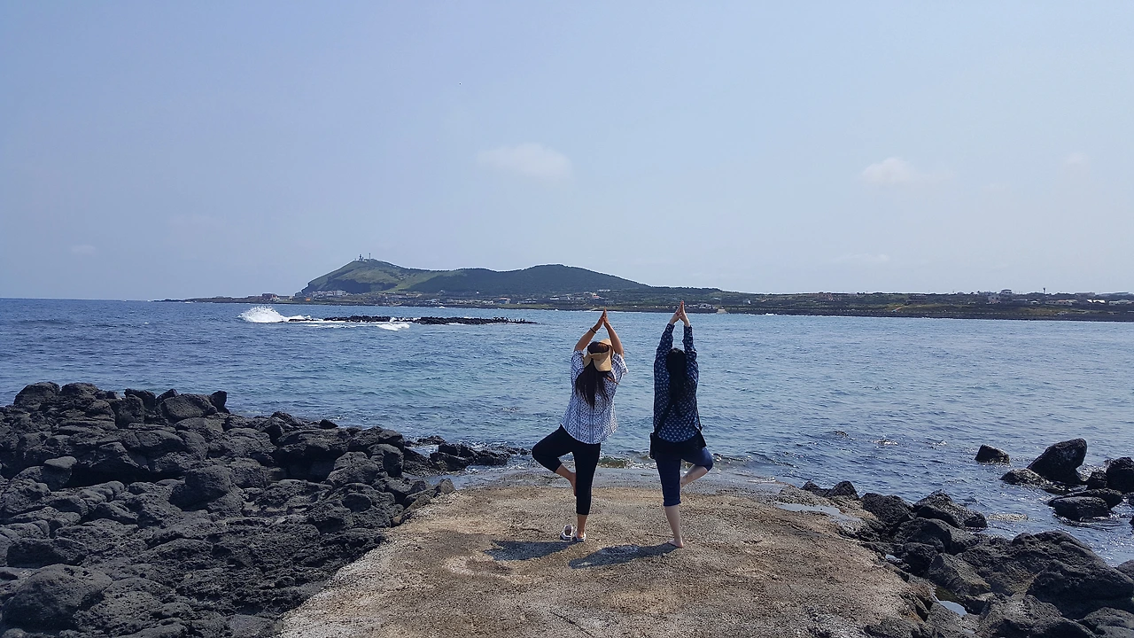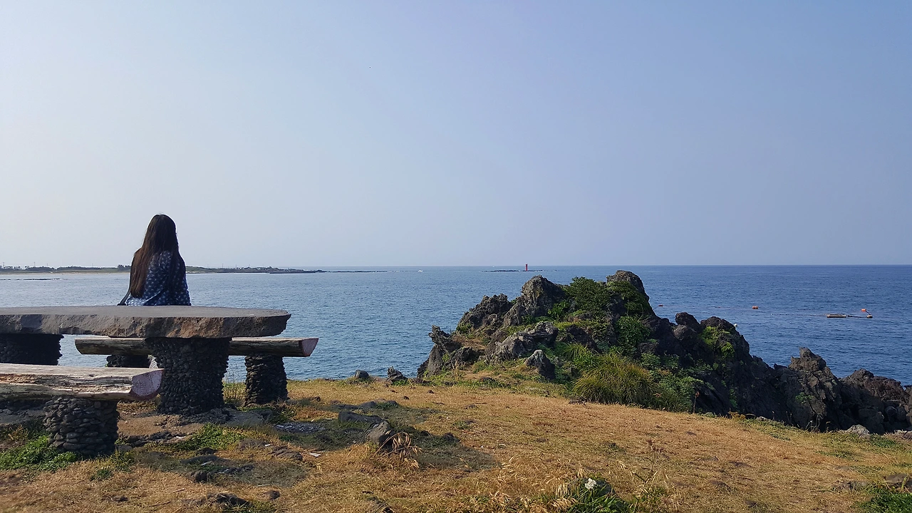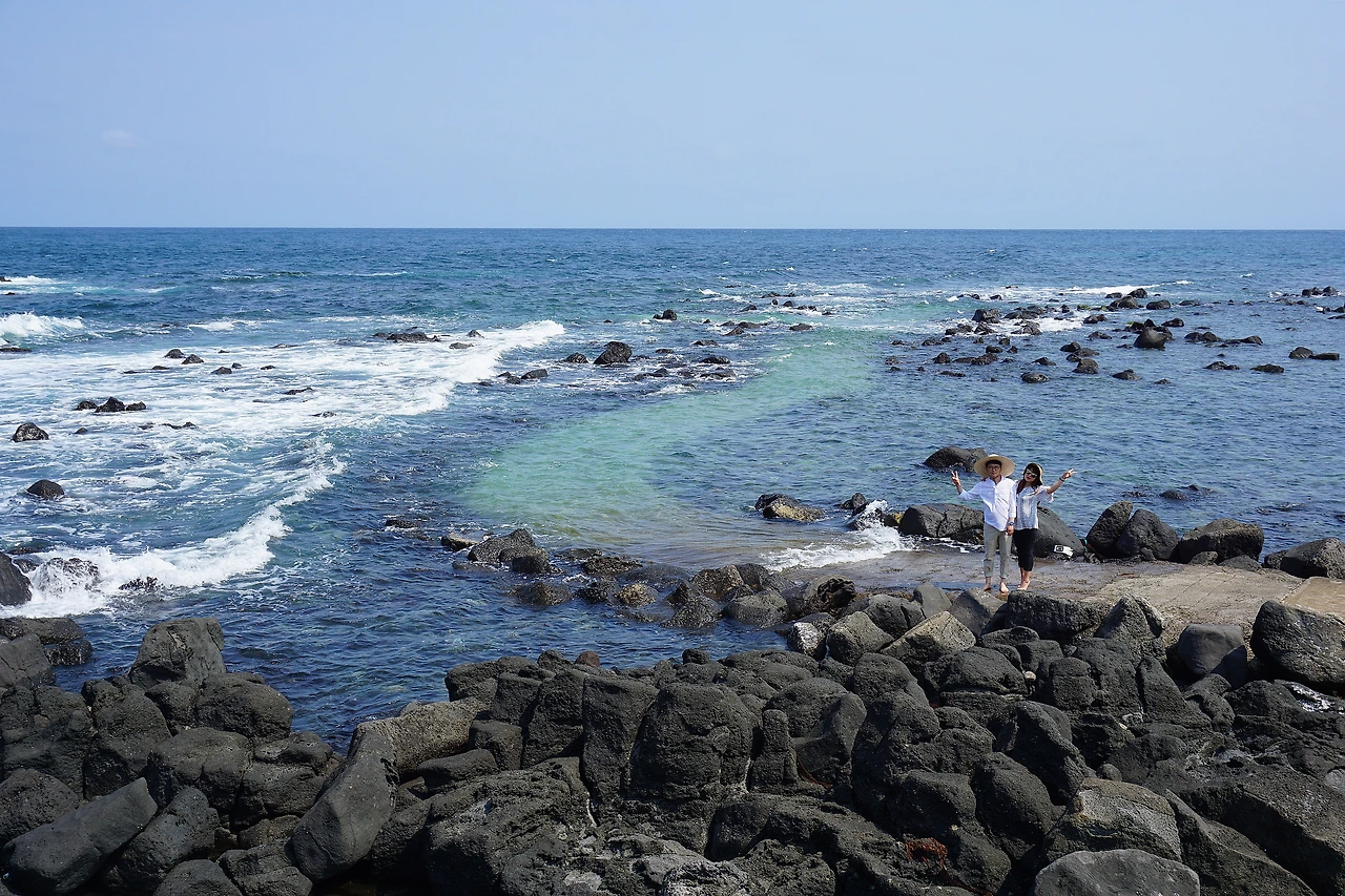 한동리 숙소로 돌아가는 길에 발견한 Hado 조각! 뒤쪽이 절벽이고 그 밑은 바다가 보이는 하도 조각상 위를 언니들은 겁 없이 올라갔다. 소시미한 나는 쭈구리처럼 밑에서 사진을 찍는다...