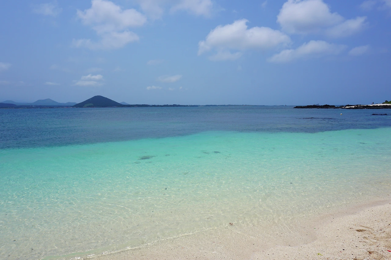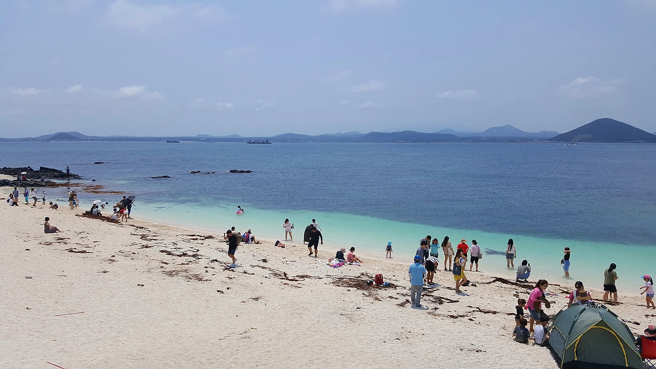 우도 마지막 코스 하고수동해수욕장. 서빈백사와 다르게 모래가 부드러워 걸을 때마다 푹신푹신해서 기분이 좋았다. 6월 중순이지만 뜨거웠던 날씨라 해수욕을 하는 아이들을 보니 물에 빠지고픈 충동도 들었다.