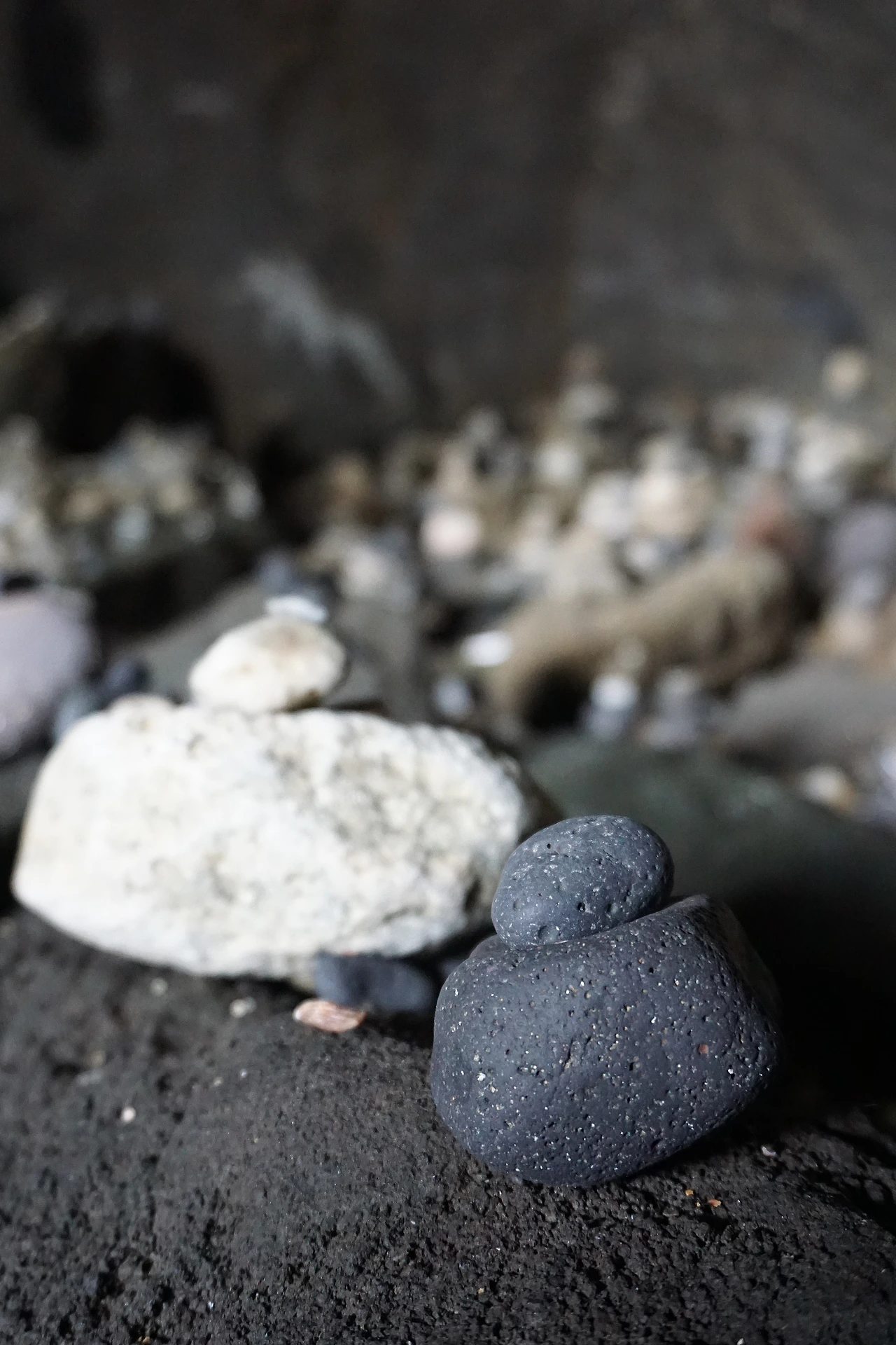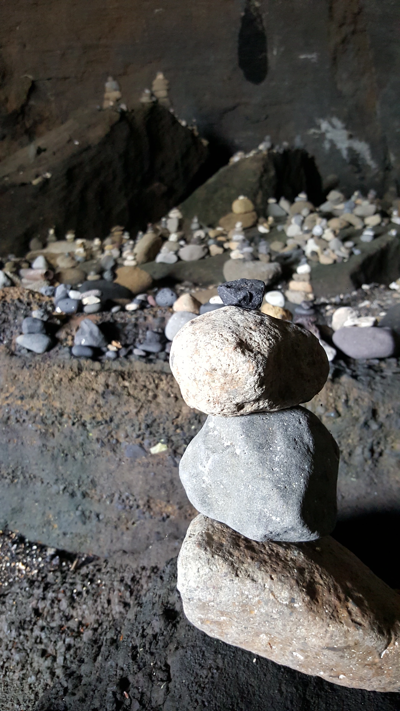 물이 빠져야 들어갈 수 있는 동안경굴. 미역 모래를 헤집고 돌길을 살짝 건너면 굴 안에 쌓아놓은 돌멩이가 나를 맞이한다. 사진 속에 담기진 않았지만 굴 안에 귀여운 돌멩탑이 가득해서 돌로 된 난쟁이가 나를 쳐다보는 느낌이었다.