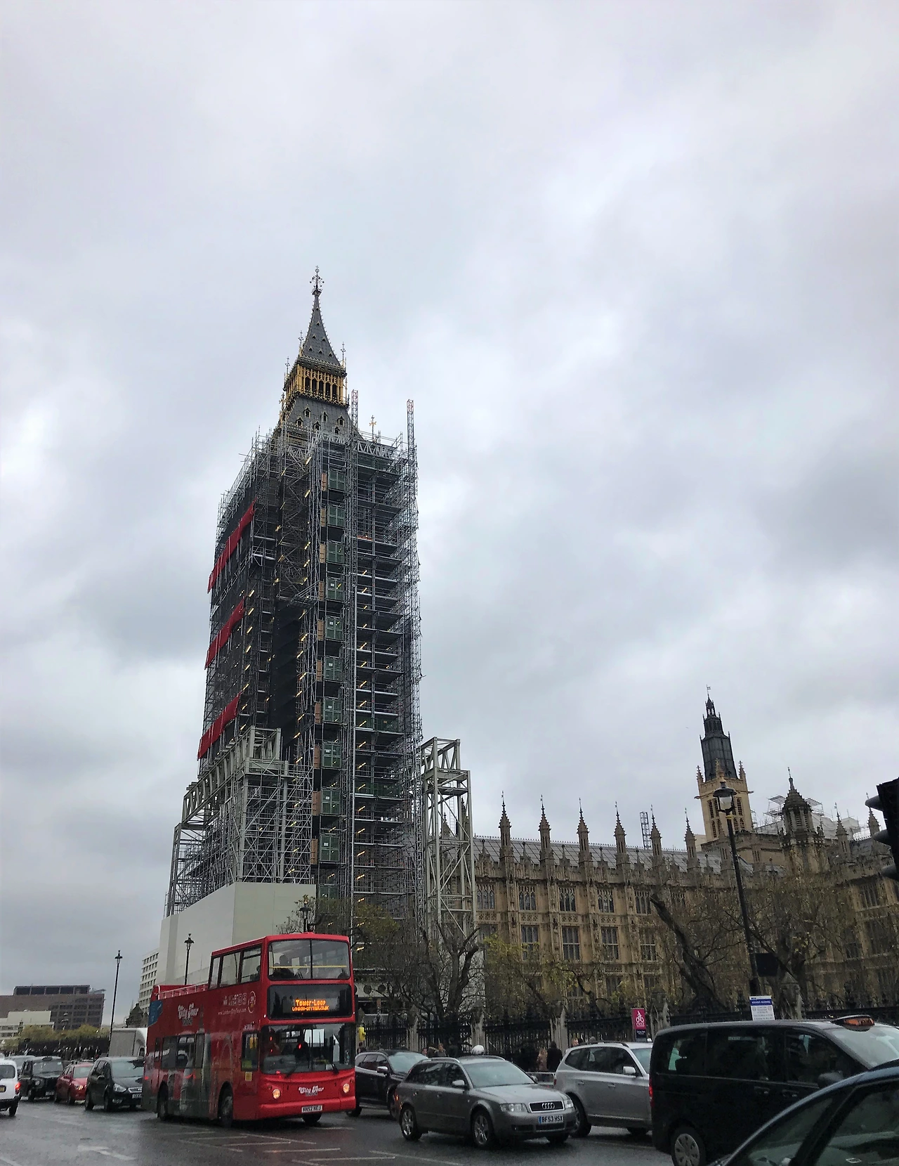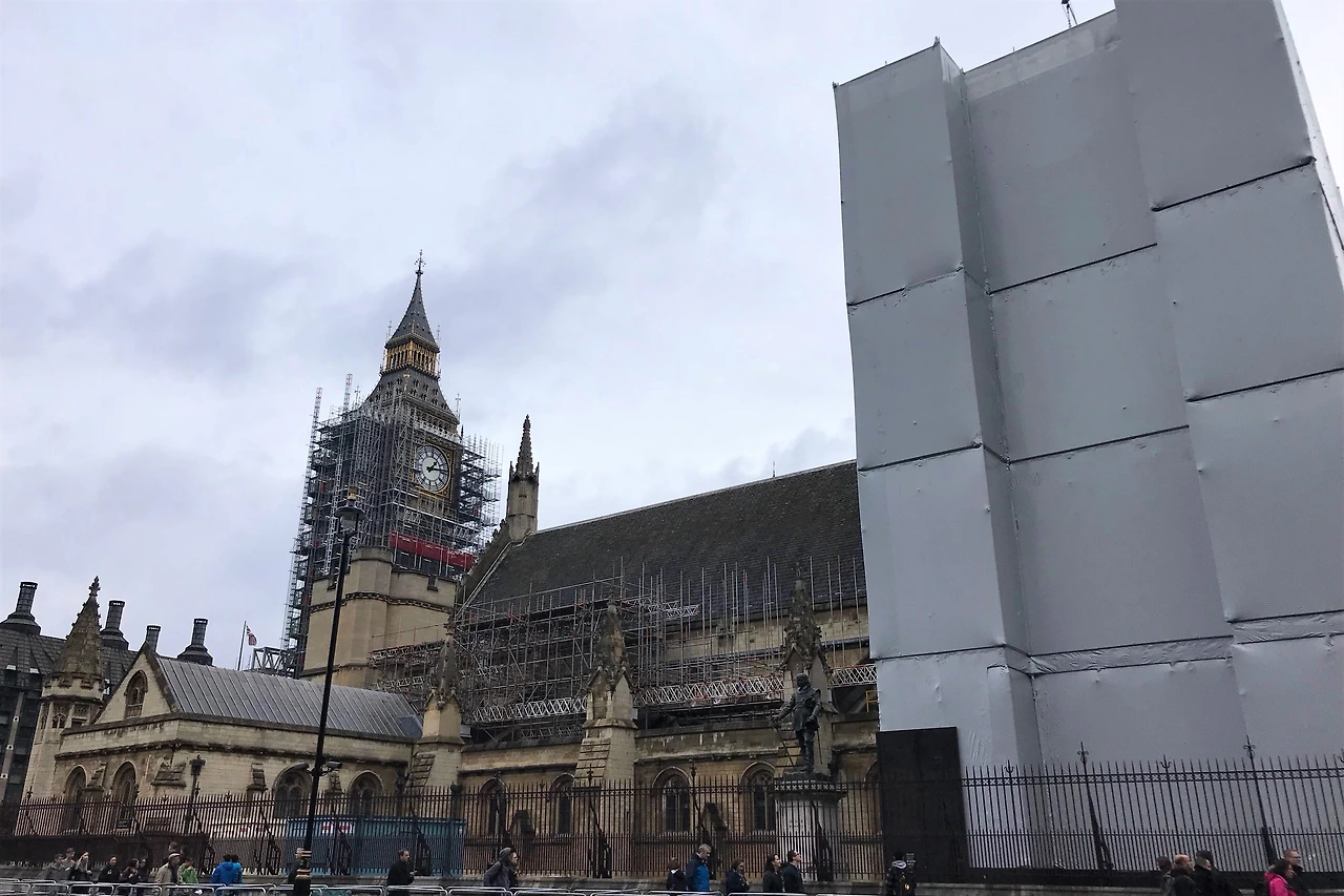 런던아이, 빅벤, 웨스터민사원, 국회의사당이 모여있는 웨스터민역으로 이동~ 내리자마자 쏟아지는 폭우와 인파에 혼이 나갔다. 그리고 문을 닫은 사원과 모든 것이 공사 중인 빅벤을 보고 2차 혼이 나갔다. 복원 중인 건 알고 있었지만 실제로 보니 스산한 날씨와 어우러져 흉물스럽구나. 공사 중 구경중.