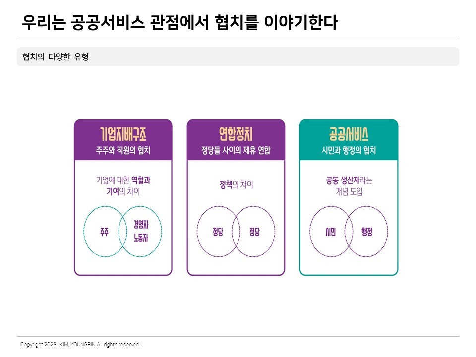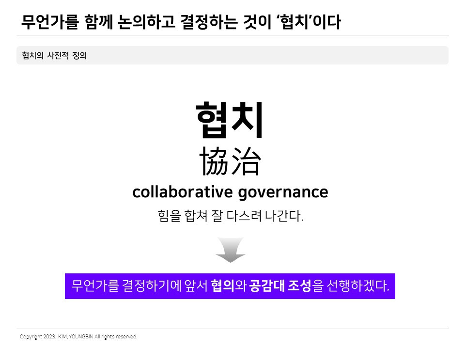우리가 이야기하는 협치라는 단어는 다소 생소하고 어려운 느낌이 든다. 협치의 사전적 정의는 '무언가를 함께 논의하고 결정'하는 것이다. 즉, 무언가를 결정할 때, 정책영역에서는 어떤 정책을 기획하고, 실행할 때 다양한 주체와 함께 논의하고 결정한다고 생각할 수 있다. 특히 공공영역에서 무언가를 시작하기 전에 공감대를 조성한다는 것이 매우 중요한 부분이다.