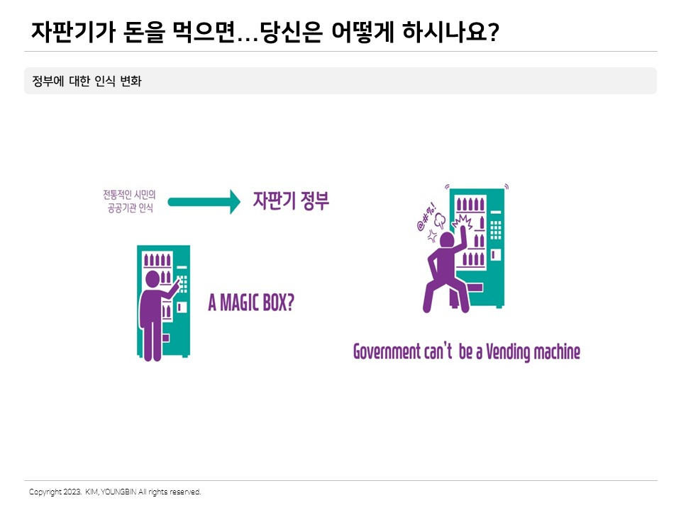 아래 재미있는 그림이 하나 있다. 자판기 앞에 사람이 있는 그림이다. 전통적으로 시민들은 정부를 자판기로 인식한다는 의미를 가지고 있다. 자판기와 관련한 우리의 경험을 한 번 떠올려보자. 자판기로 가서 동전을 넣고 음료수를 받아서 갈증을 해소한다라는 것이 바람직한 그림이다. 하지만 가끔 자판기에 동전을 넣었는데 음료수가 나오지 않는 경우를 경험한 적이 있을 것이다. 동전을 먹은 것이다. 나의 피같은 동전을 먹고 음료수를 주지 않았다.