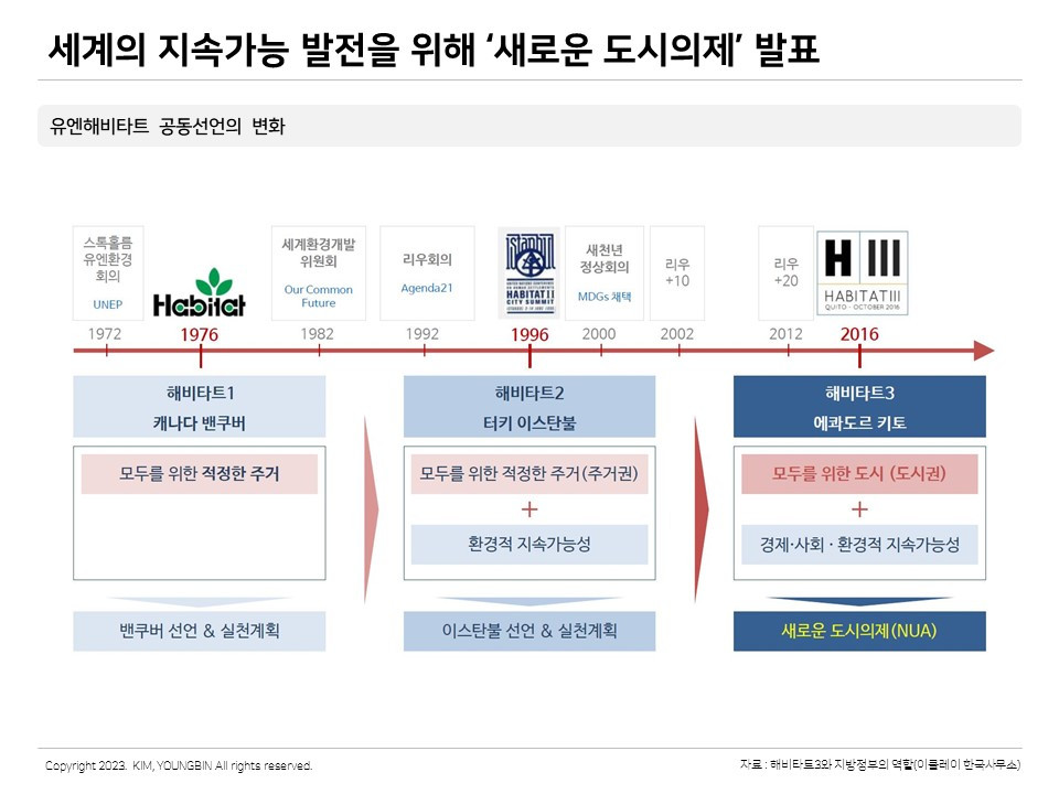 유엔해비타트는 정기적으로 우리 인류가 나아가야 할 비전을 공동선언문 형식으로 발표하고 있다. UN에서 20년마다 개최되는 해비타트 회의는 세계의 다양한 정책 당국자, 전문가들이 모여 향후 20년 간의 글로벌 관점의 도시정책 방향을 논의하는 회의이다. 2016년 해비타트3 회의에서는 2030년까지 인류가 나아가야 할 방향을 담은 공동선언문을 ‘새로운 도시의제(New Urban Agenda)’라는 이름으로 발표하였다. 에콰도르 키토(Quito)에서 회의를 진행하여 키토 선언이라고 불리기도 한다.