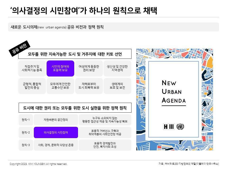 다시 돌아와서 제3차 새로운 도시의제의 내용을 살펴보자. 새로운 도시의제는 8개의 공유비전과 3개의 정책 원칙으로 방향을 제시하고 있다. 8개 공유비전 중 하나로 ‘시민의 참여와 포용력 보유’를 제시하고 있고, 실현방안 중 하나로 ‘의사결정의 시민참여’를 강조하고 있다. 앞으로 다가올 글로벌 도시정책에서 필요한 하나의 큰 줄기로 ‘정책결정과정의 시민참여‘를 제시하고 있는 것이다.
