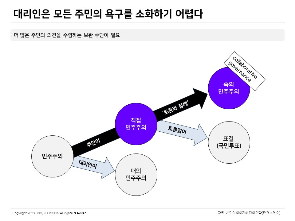 위 그림을 살펴보자. 민주주의 유형에 대한 도식이다. 민주주의는 크게 대의민주주의와 직접민주주의로 나누어진다. 그리고 직접민주주의에서 토론 없이 모든 사람에게 의견을 물어보는 것이 국민투표이고, 토론과 함께 의견을 교환하는 것이 숙의민주주의라고 볼 수 있다. 민관협치를 대입하면 숙의민주주의와 가장 근접하지 않을까 싶다. 민관협치는 기존의 대의민주주의의 손길이 닿기 어려운 부분에서 역할을 한다고 생각한다. 계속 이야기하지만 요구하는 메뉴가 너무 많아서 대의민주주의도 너무 바쁘다.