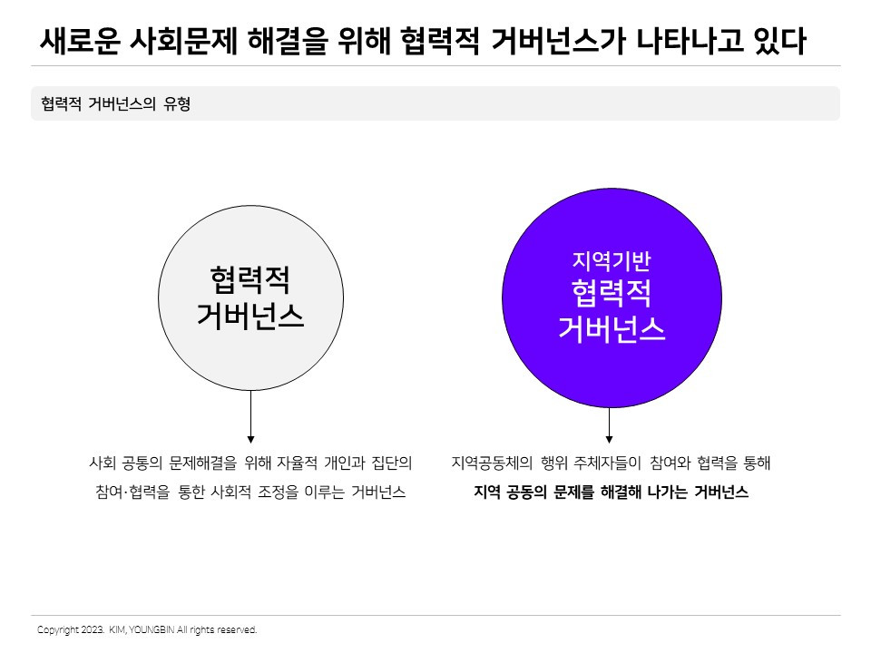 그래서 우리는 역할 분담을 좀 해야 하지 않을까 한다. 수많은 욕구 중에 시민이 함께 참여해서 진행했을 때 더 효과적인 부분들이 있을 것이다. 그런 부분 중심으로 시민과 공무원이 함께 하는 구조를 가져간다면 과부하를 좀 줄일 수 있지 않을까? 다양하고 새로운 사회문제를 해결하기 위해, 그리고 해결을 더 잘하기 위해, 협력적 거버넌스가 나타나고 있다. 특히, 다양한 주체가 참여하는 협력적 거버넌스는 일정 지역을 한정하고 활동했을 때 더욱 효과적이라고 한다. 가만 생각해 보면 어떤 주제에 대해 대화하고 의견을 교류할 때 내가 살고 있는 동네나 지역에 대해 훨씬 더 활발하게 진행될 것이라는 것은 당연하다. 그래서 많은 자료와 사례에서 협력적 거버넌스의 공간적 범위는 너무 넓지 않은 것이 효과적이라고 말하고 있다.