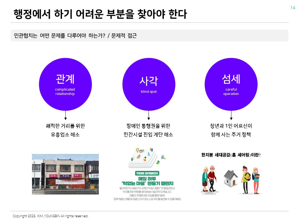 예를 하나 들어보자. 도심 주거지 주변에 간혹 유흥업소 골목이 있는 경우가 있다. 과거 작았던 도시의 범위가 확장되면서 밀집 유해시설과 주거지역이 본의 아니게 가깝게 되는 사례이다. 최근에는 다양한 정책으로 많이 사라지는 추세이지만 이런 문제의 경우 정책으로 접근하기가 꽤 어렵다. 주거지역 입장에서는 아이들의 교육 환경, 생활공간의 질적인 측면 등 다양한 애로사항이 존재한다. 하지만 건축물 소유자 입장에서는 건축물 임대 관점에서 경제활동을 하고 있다. 또 하나 유해업소 운영자와 종사자의 입장도 나름 존재하고 있다. 이렇게 다양한 관계가 얽혀 있고, 각자의 이해관계가 첨예한 경우 행정조직의 자원만으로는 문제를 해결하기 어려울 수 있다. 지역 주민과 다양한 민간파트너가 협력하여 해결을 모색하는 판을 만드는 것이 주요한 부분이고, 그것으로부터 문제해결의 단초를 찾을 수 있다.