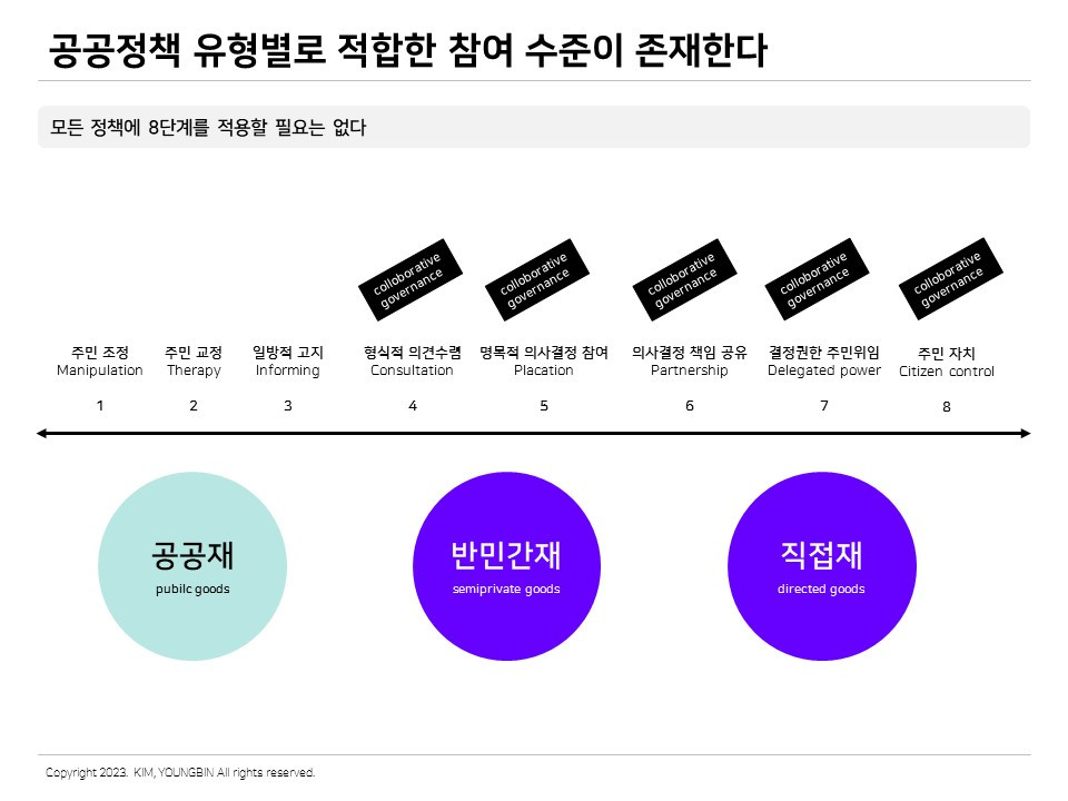 민관협치도 마찬가지이다. 각 공공정책의 유형별로 적합한 참여 수준이 있다. 예를 들면 어떤 정책사업의 경우 형식적 의견수렴이 적합할 수도 있고, 때론 공동의 의사결정이 적합할 수도 있다. 민간파트너의 장점이 확실하다고 판단되는 때에는 적극적 재량 위임 단계가 적합할 것이다. 예를 들면 반민간재나 직접재 성격의 정책은 적극적 민관협치가 꽤 유용하다. 하지만 공공재의 경우 아주 소극적인 참여 수준만으로도 충분할 수 있다. 이처럼 다양한 정책사업의 특성별로 그에 필요한 최적의 참여 수준과 방법을 고민하는 것이 필요하다.