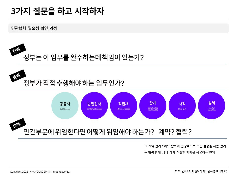 이제까지 공공서비스 관점의 민관협치에 대한 의미와 맥락에 대해 알아보았다. 이번 챕터를 마무리하며 공공서비스 관점에서 민관협치를 접근할 때 3가지 질문으로 시작하는 것을 제안한다.