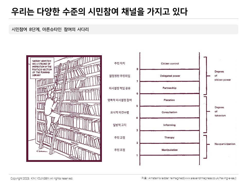 시민참여나 민관협치 정책을 이야기할 때 자주 언급되는 개념이 하나 있다. 아른슈타인의 참여의 사다리이다. 참여의 사다리는 시민이 정책결정과정에 참여하는 수준을 8단계로 구분하고 있다. 아주 소극적으로 참여하는 단계부터(1단계) 매우 적극적으로 재량을 위임받아 참여하는 단계까지(8단계) 구분해 놓은 것이다. 우리가 흔히 하고 있는 공청회의 경우 형식적 의견수렴(4단계)과 명목적 의사결정 참여(5단계) 그 사이 어디쯤에 위치하고 있을 듯하다. 지방정부에서 시민참여 정책을 기획할 때 참여인식 설문조사의 기준으로 많이 활용하고 있다.