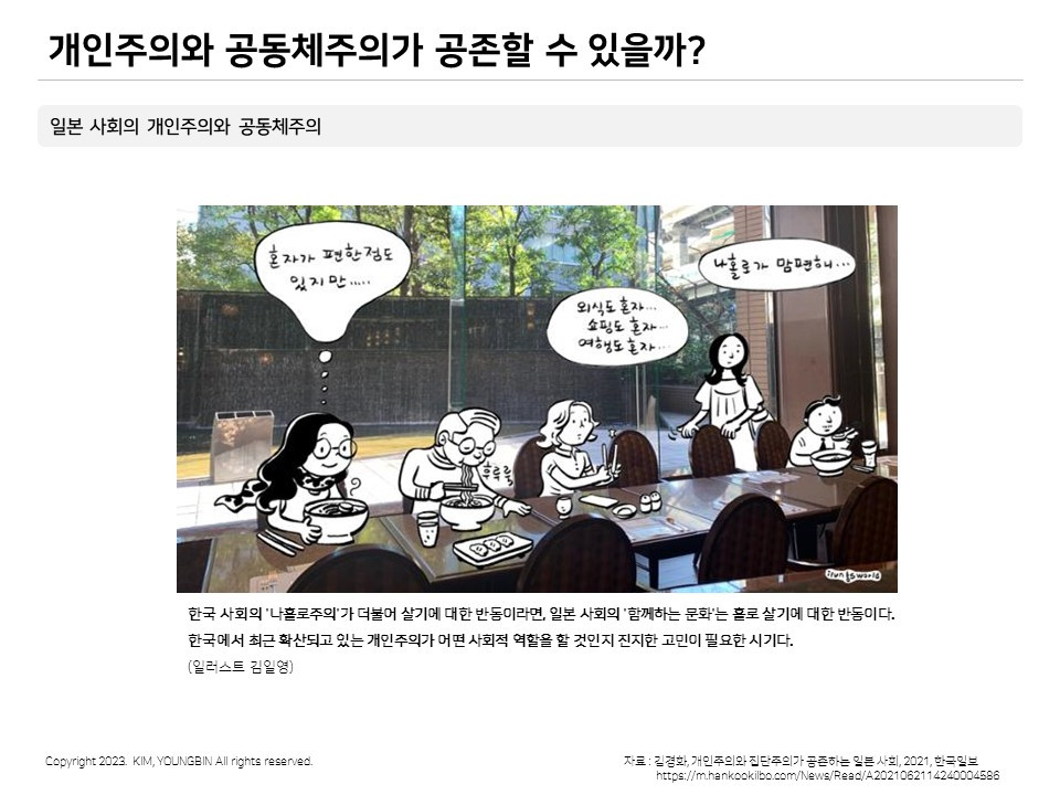 하지만 무엇이든 조화가 중요하다. 역사적으로도 중용이라는 가치는 매우 높다. 그렇다면 개인주의와 공동체주의도 적절하게 조화를 이루는 것이 좋지 않을까? 중용이라는 관점에서는 꽤 설득력 있다. 일본 사회는 개인주의와 공동체주의가 공존한다고 한다. 일상생활에서는 개인주의가 당연하지만, 국가 등의 위기나 상황이 발생하면 공동체주의가 강하게 발동한다고 한다. 그것이 어느 정도인지 자세히는 모르겠지만 공존을 추구한다는 것은 살펴볼만하겠다.