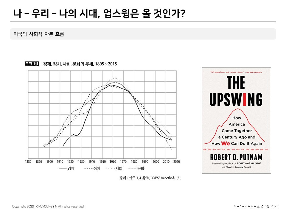 최근 125년 간의 미국 사회를 한 마디로 정리하면 나-우리-나의 시대라는 것이다. 1800년대 후반부터 1900년도 초중반까지는 개인주의 시대였고, 1900년대 초중반을 넘어가며 공동체주의가 강하게 형성되었다. 그리고 1900년대 후반부터 최근에 들어서는 다시 개인주의 시대로 돌아가고 있다고 이야기한다. 재미있는 것은 이 곡선의 추이가 경제 성장을 비롯하여 다양한 사회 현상 추이와 유사하다는 것이다. 한국도 매우 유사한 현상이 나타나고 있다. 책의 내용을 따라가다 보면 사회적 자본이 잘 축적되었을 때 우리 사회의 다양한 긍정적 측면이 확산된다는 내용을 유추할 수 있다. 더불어 사회적 자본의 중요성이 상대적으로 약해지는 이유도 함께 설명하고 있다. 내용을 읽다 보면 비단 미국에만 해당하는 것은 아닌 듯하다.