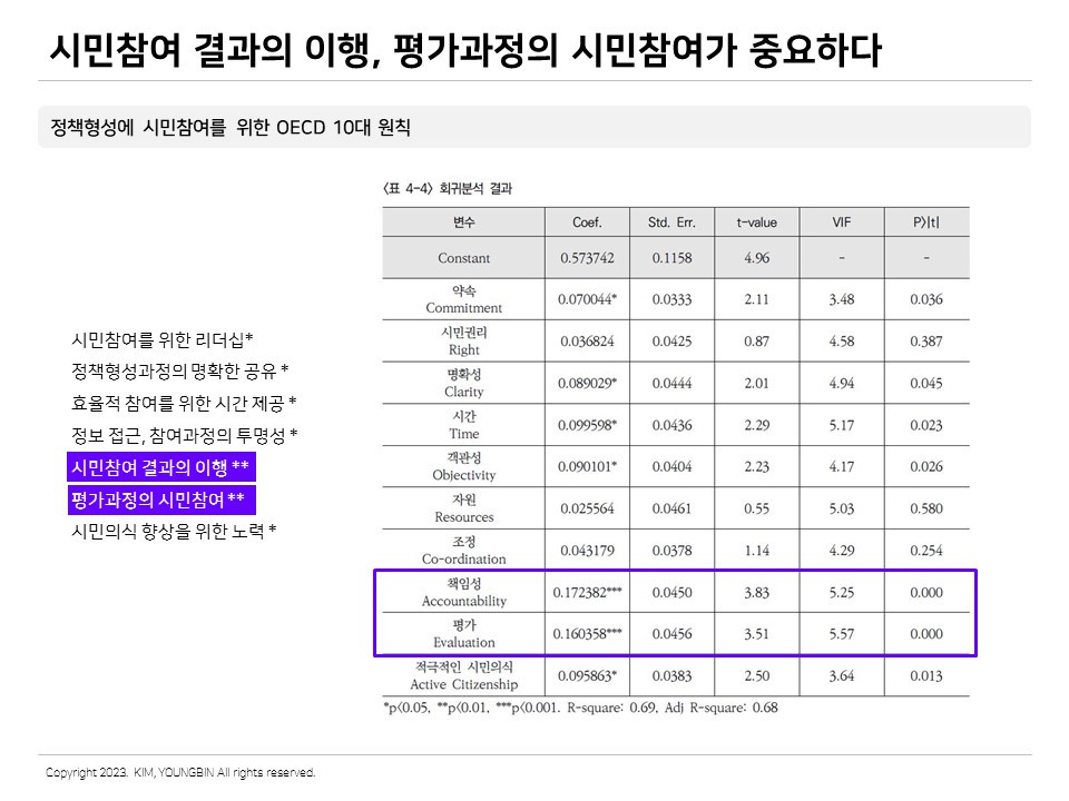 결과는 어땠을까? 어떤 요소가 가장 중요하다고 대답했을까? 결론부터 말하면 가장 중요하다고 언급한 요소는 책임성(accountability)과 평가(evaluation)이다. 정책의 거버넌스로 적극적으로 참여한 사람들은 시민 제안사안에 대한 실행을 담보하는 것과 평가과정에 시민이 참여하는 것을 가장 중요하게 생각하고 있다. 이 두 가지 요소가 잘 이루어졌을 때 정책만족도가 높아진다고 볼 수 있다.