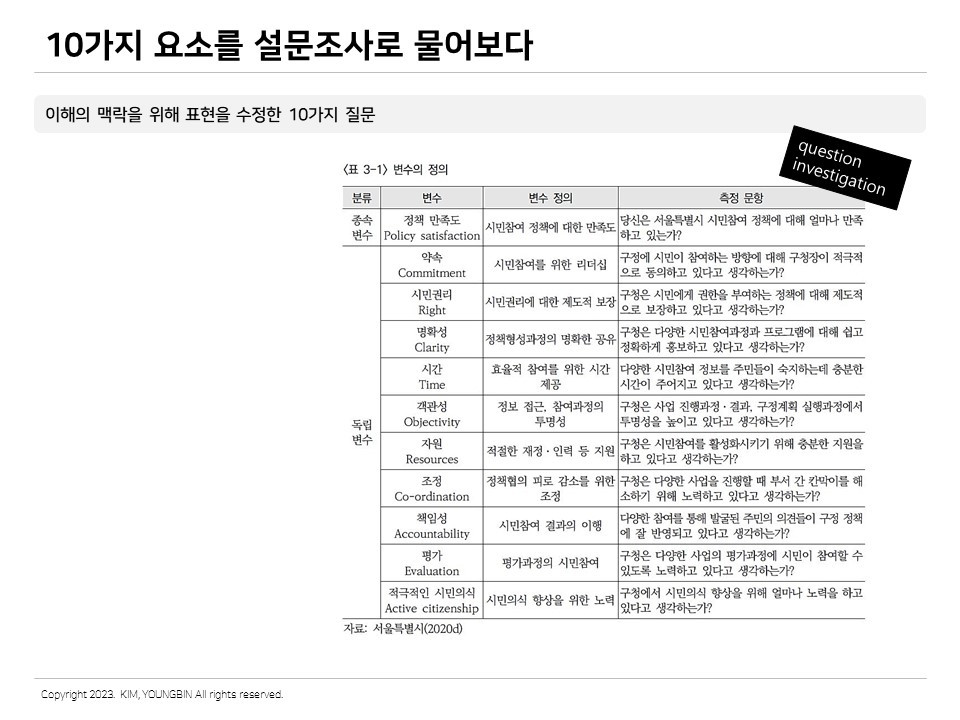 그래서 물어봤다. 시민참여정책에 나름 깊게 참여하고 있는 참여자 대상으로 설문조사를 진행했다. 위의 10가지 핵심요소를 이해가 쉽도록 표현을 수정하여 질문지를 만들었고 더불어 정책의 전반적 만족도도 함께 조사했다. 설문조사의 대상자들은 앞서 이야기한 시민의 유형 중 정책의 거버넌스에 직접 참여하는 코어그룹에 해당한다. 분석의 방법은 10가지 핵심요소와 정책만족도 간의 관계를 살펴보았다. 어떤 요소가 정책만족도를 높이는데 가장 큰 기여를 하는가에 대한 분석이다.