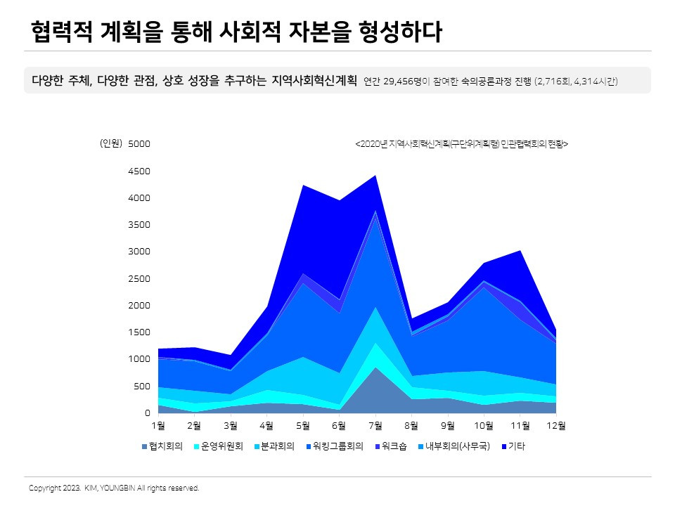 그렇지만 희망적인 것은 인간은 경험을 통해 성장한다. 위 그래프는 몇 년전 서울시에서 진행했던 협력적 계획(지역사회혁신계획)의 숙의회의 통계이다. 서울시 19개의 자치구가 1월부터 12월까지 진행한 다양한 민관협력회의를 보여주고 있다. 1년에 2,700회 정도의 참여 회의를 진행했으니 그 과정이 결코 가볍지 않다. 실제 현장을 살펴보았을 때 1년 정도 지나면 참여자들의 태도가 변하기 시작한다. 처음에는 어색하고, 다른 사람 의견을 인정하기도 어려웠지만 시간이 지나면 그 감수성이 성장하기 시작하여, 긍정의 선순환이 어렴풋이 그려진다. 1~2년 정도 지나고 나면, 감수성이 낮은 새로운 참여자가 합류했을 때 기존 참여자들의 도움으로 감수성의 성장 속도를 가속화시킨다.