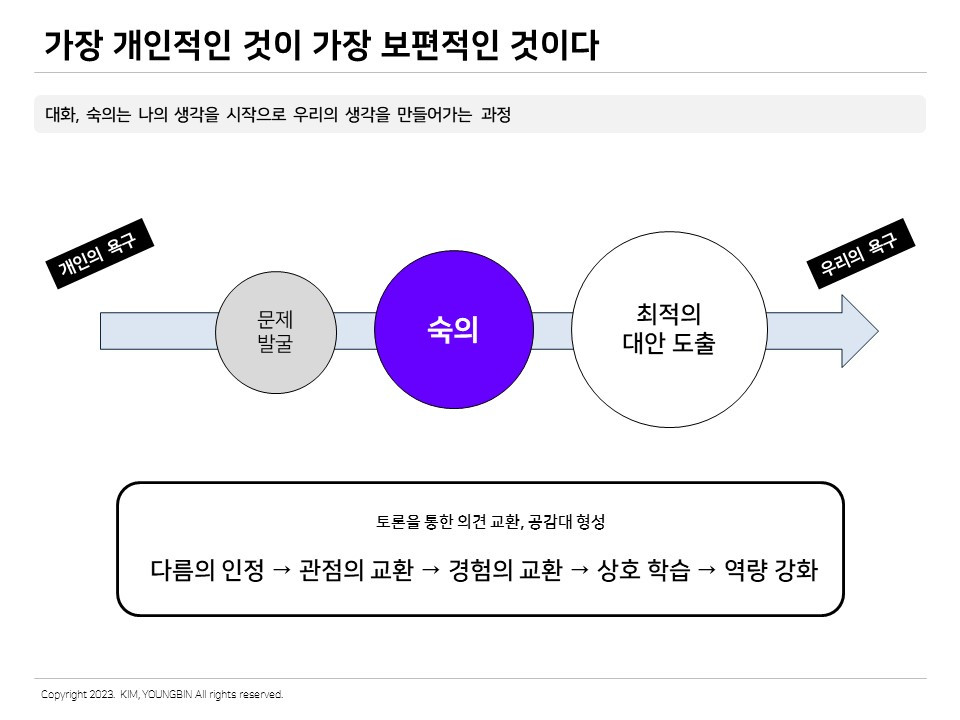 어렵지만 도전하는 관점에서 대화의 과정에 대해 알아보자. 현장에서 다 같이 모여 이야기를 시작하면 머뭇거리는 사람들이 많다. 이유는 다양하지만 그중에 하나가 개인적인 이야기를 하는 것에 대한 걱정과 염려이다. 뭔가 공적인 주제와 정책에 대해 이야기를 해야 할 것 같은 테이블에서 사적인 생각과 접근의 나 자신을 염려하곤 한다.