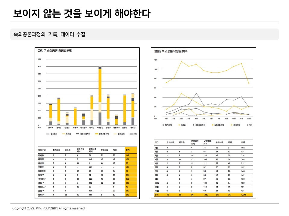 무언가를 보이게 하기 위해서는 측정을 해야 한다. 기술의 발달을 활용하면 좋겠지만 그것이 어렵더라도 측정을 고민하는 것이 필요하다. 상호작용의 대화를 중심으로 하는 협력적 계획의 과정도 측정이 필요하다. 1차원적인 접근이라도 측정을 해야 한다. 몇 년 전 서울시에서 진행한 협력적 계획은 1차적으로 회의 참여자 수를 측정했다. 수많은 회의마다 참여자를 측정하는 것이 귀찮고 어렵지만 과정의 시간이 모이면 기록의 힘이 나타난다. 한 번 데이터가 쌓이기 시작하면 다양한 관점에서 분석이 가능하다. 참여자의 연령별 추이, 분야적 특성 등의 참여주체 속성에 대한 분석이 가능하고, 월단위 참여 추이 등 시계열 분석도 가능하다. 더불어 지역별 참여 추이와 특성에 대한 비교 분석도 가능하다.