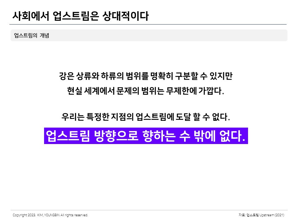 하지만 우리가 살아가는 사회는 강물과 다른 점이 있다. 강물은 물리적으로 상류와 하류를 명확하게 구분할 수 있지만 사회현상은 그렇지 않다. 그렇게 딱딱 떨어지지 않는다. 그렇기에 우리는 상대적 개념을 활용해야 한다. 그저 더욱 상류에 해당하는 방향으로 나아가는 수밖에 없다. 수많은 변수가 작동하는 사회(social)라는 현실세계에서는 산 꼭대기 아주 작은 물줄기의 시작점을 찾는 것은 불가능에 가깝다. 그러하니 문제의 원인을 찾았는데 결과가 신통치 않았다고 실망하지 말자. 당신이 찾았다고 생각한 것이 진짜 원인이 아니었을 확률도 꽤 높다. 우리는 최대한 강의 상류(upstream)로 가려고 노력하는 것이 중요하다.