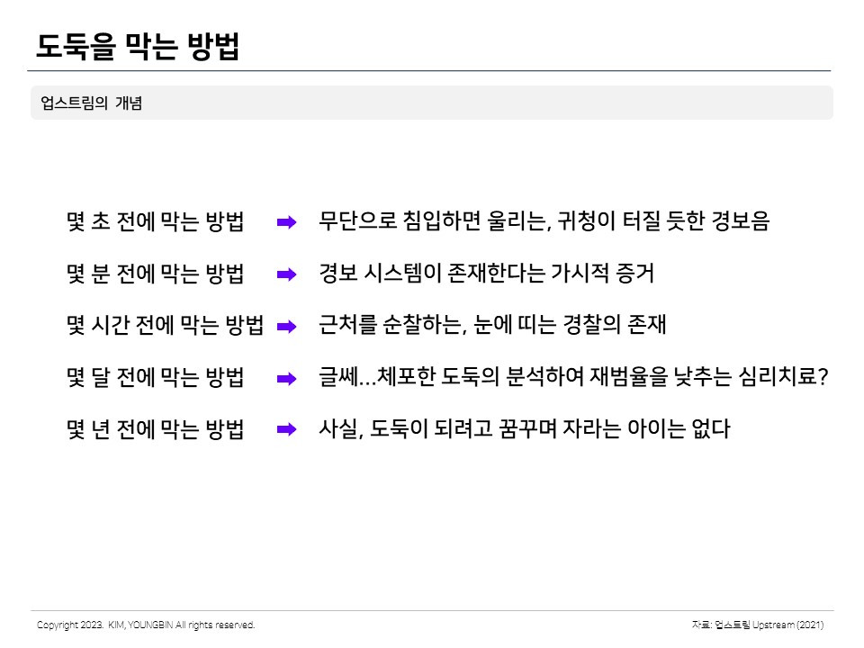 문제 원인의 상류 개념을 이해하기 위해 예시를 하나 가져왔다. 도둑을 막는 방법이다. 도둑을 막는 방법은 어떤 것이 있을까? 초단위부터 연단위까지 다양하게 생각해 볼 수 있다. 단기적으로 도둑을 막는 방법은 각종 경보장치 시스템을 이용하는 것이다. 우리가 흔히 CCTV를 설치하여 범죄를 예방하는 개념과 비슷하다. 하지만 근본적으로 도둑 없는 사회를 만들기 위해서는 재범률을 하락시키기 위한 방법, 도둑이 발생하지 않는 경제적, 사회적 환경을 만드는 방법을 모색하는 것이 필요하다.